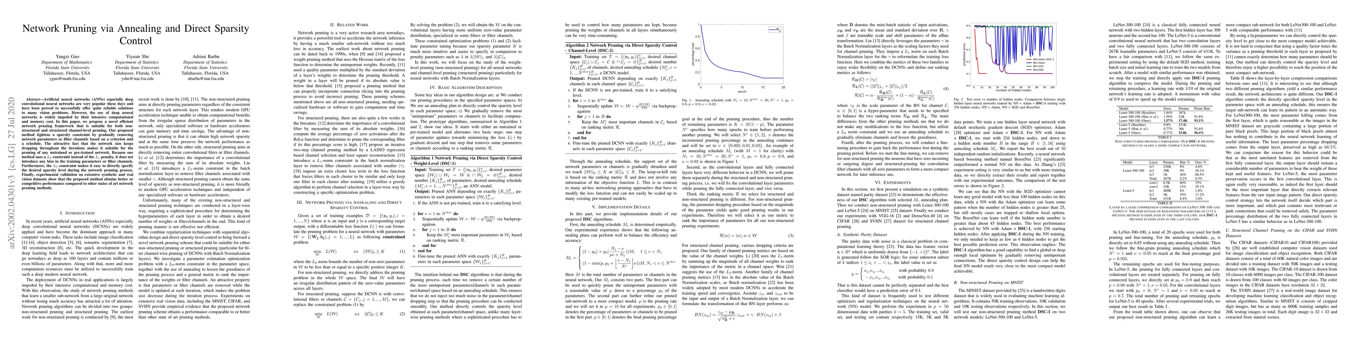This paper proposes a novel network pruning method that employs annealing and direct sparsity control for both non-structured and structured channel-level pruning, using an $L_0$ constraint to avoid bias and directly specify desired sparsity levels, achieving competitive performance on vision tasks.