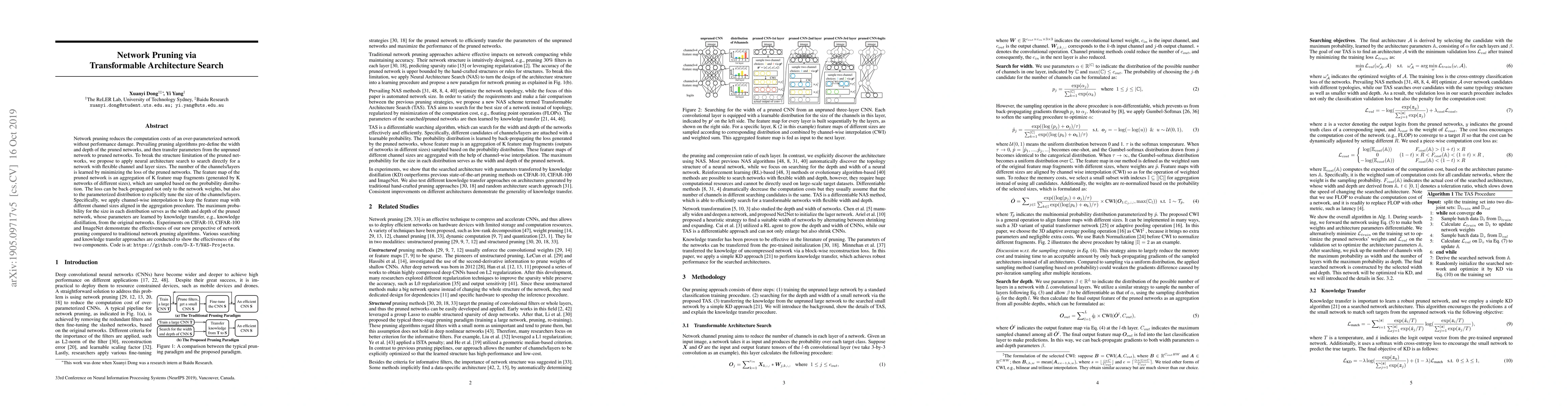 This paper proposes a novel network pruning method using transformable architecture search to create flexible networks with adaptive channel and layer sizes. It employs neural architecture search to directly optimize the network structure, minimizing loss through knowledge transfer and back-propagation to the parameterized distribution, demonstrating improved performance on CIFAR-10, CIFAR-100, and ImageNet datasets.