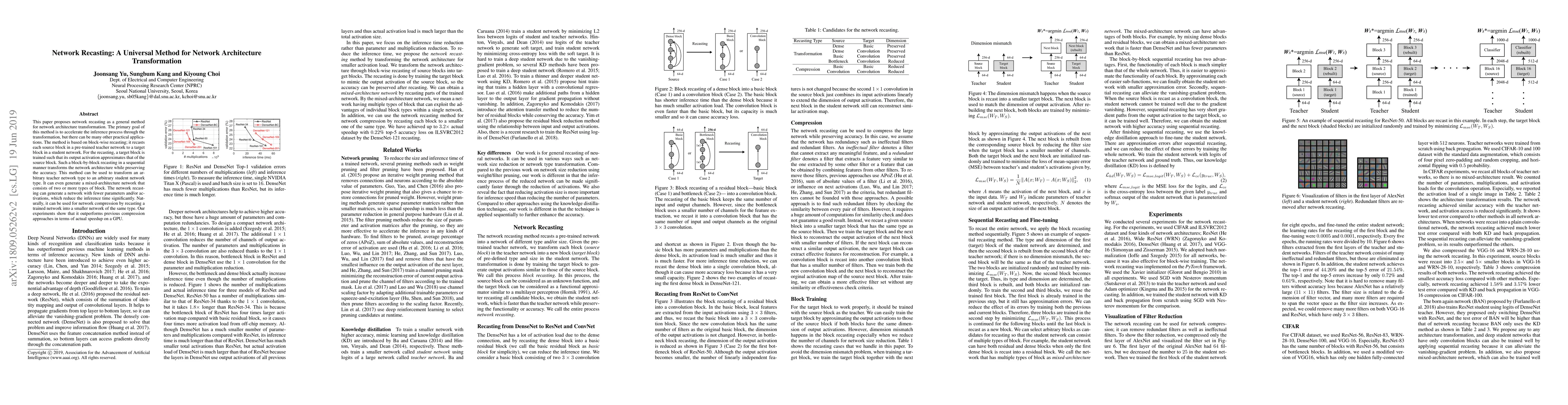 This paper proposes network recasting as a general method for network architecture transformation. The primary goal of this method is to accelerate the inference process through the transformation, but there can be many other practical applications. The method is based on block-wise recasting; it recasts each source block in a pre-trained teacher network to a target block in a student network. For the recasting, a target block is trained such that its output activation approximates that of the source block. Such a block-by-block recasting in a sequential manner transforms the network architecture while preserving the accuracy. This method can be used to transform an arbitrary teacher network type to an arbitrary student network type. It can even generate a mixed-architecture network that consists of two or more types of block. The network recasting can generate a network with fewer parameters and/or activations, which reduce the inference time significantly. Naturally, it can be used for network compression by recasting a trained network into a smaller network of the same type. Our experiments show that it outperforms previous compression approaches in terms of actual speedup on a GPU.