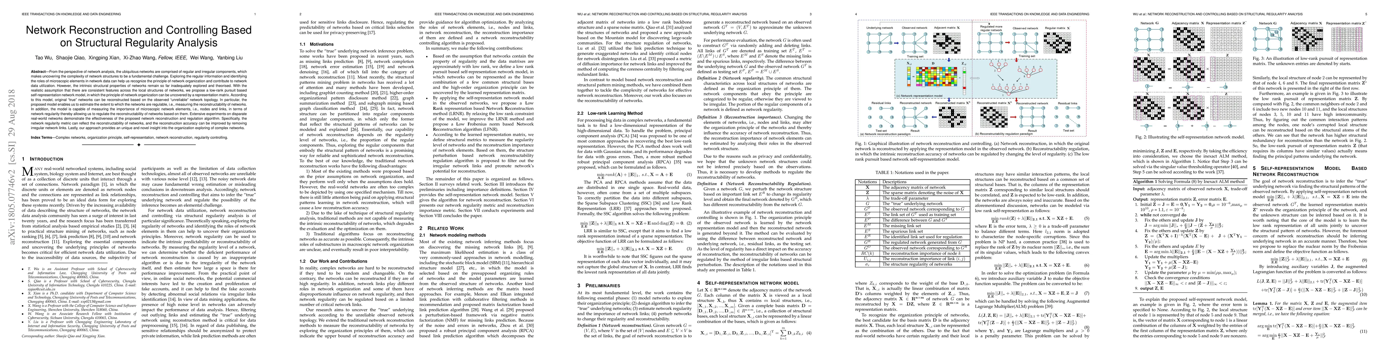 From the perspective of network analysis, the ubiquitous networks are comprised of regular and irregular components, which makes uncovering the complexity of network structures to be a fundamental challenge. Exploring the regular information and identifying the roles of microscopic elements in network data can help us recognize the principle of network organization and contribute to network data utilization. However, the intrinsic structural properties of networks remain so far inadequately explored and theorised. With the realistic assumption that there are consistent features across the local structures of networks, we propose a low-rank pursuit based self-representation network model, in which the principle of network organization can be uncovered by a representation matrix. According to this model, original true networks can be reconstructed based on the observed unreliable network topology. In particular, the proposed model enables us to estimate the extent to which the networks are regulable, i.e., measuring the reconstructability of networks. In addition, the model is capable of measuring the importance of microscopic network elements, i.e., nodes and links, in terms of network regularity thereby allowing us to regulate the reconstructability of networks based on them. Extensive experiments on disparate real-world networks demonstrate the effectiveness of the proposed network reconstruction and regulation algorithm. Specifically, the network regularity metric can reflect the reconstructability of networks, and the reconstruction accuracy can be improved by removing irregular network links. Lastly, our approach provides an unique and novel insight into the organization exploring of complex networks.