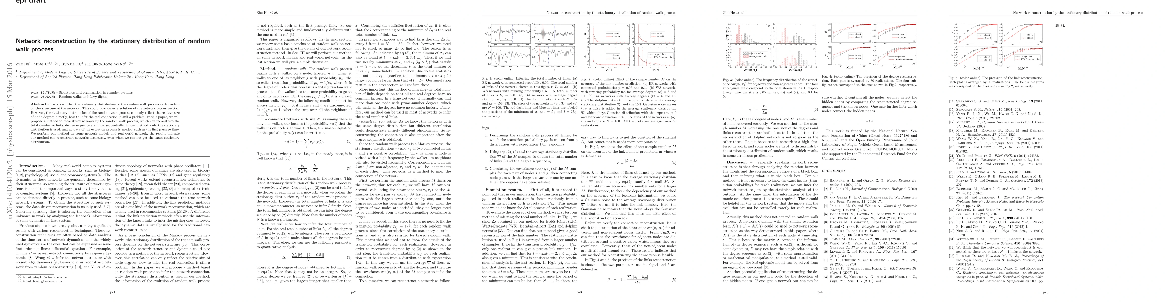It is known that the stationary distribution of the random walk process is dependent on the structure of the network. This could provide us a solution of the network reconstruction. However, the stationary distribution of the random walk process can only reflect the relative size of node degrees directly, how to infer the real connection is still a problem. In this paper, we will propose a method to reconstruct network by the random walk process, which can reconstruct the total number of links, degree sequence and links sequentially. In our method, only the stationary distribution is used, and no data of the evolution process is needed, such as the first passage time. We perform our method on some network models and real-world network, the results indicate our method can reconstruct networks accurately, even when we can not get the exact stationary distribution.