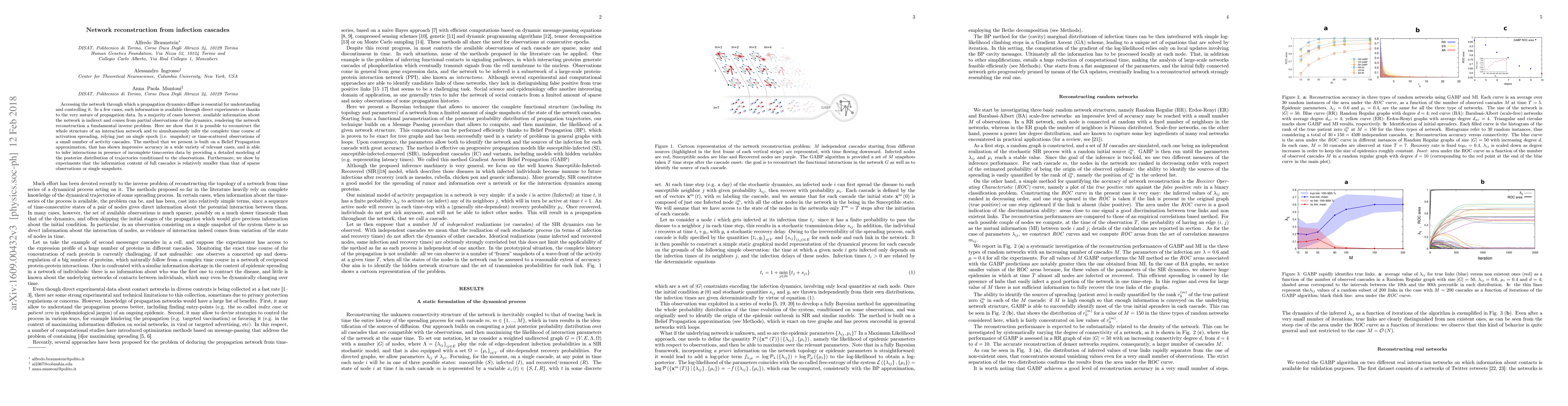 Accessing the network through which a propagation dynamics diffuse is essential for understanding and controlling it. In a few cases, such information is available through direct experiments or thanks to the very nature of propagation data. In a majority of cases however, available information about the network is indirect and comes from partial observations of the dynamics, rendering the network reconstruction a fundamental inverse problem. Here we show that it is possible to reconstruct the whole structure of an interaction network and to simultaneously infer the complete time course of activation spreading, relying just on single epoch (i.e. snapshot) or time-scattered observations of a small number of activity cascades. The method that we present is built on a Belief Propagation approximation, that has shown impressive accuracy in a wide variety of relevant cases, and is able to infer interactions in presence of incomplete time-series data by providing a detailed modeling of the posterior distribution of trajectories conditioned to the observations. Furthermore, we show by experiments that the information content of full cascades is relatively smaller than that of sparse observations or single snapshots.
