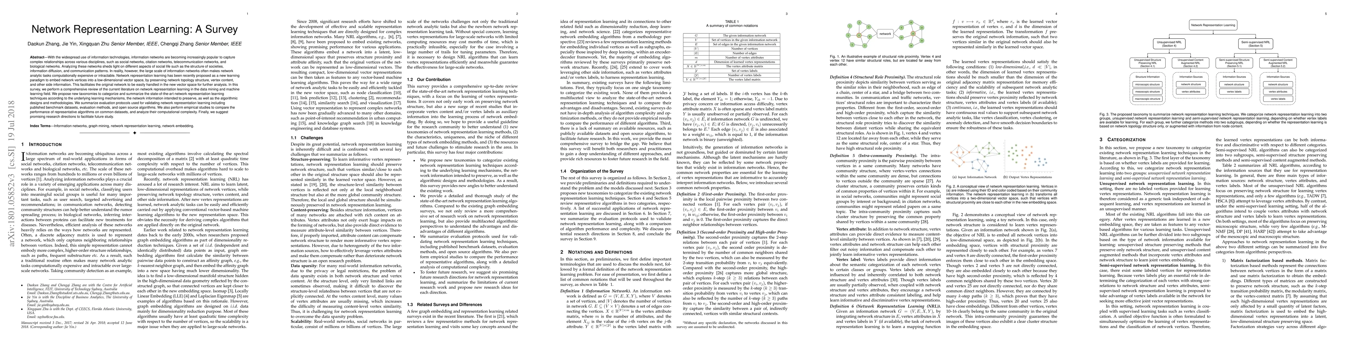 This survey paper comprehensively reviews network representation learning techniques, categorizing them based on learning mechanisms, preserved network information, and algorithmic designs. It also summarizes evaluation protocols, compares algorithm performance, and suggests future research directions in handling large-scale information networks for efficient analysis.