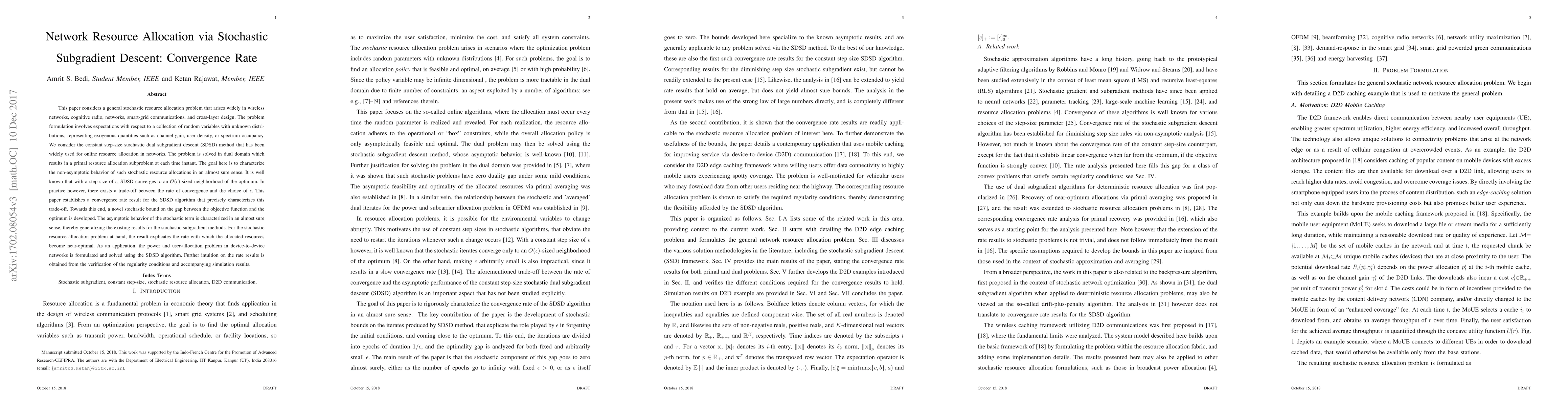 This paper investigates the convergence rate of a stochastic dual subgradient descent (SDSD) method for resource allocation in dynamic network environments, establishing a precise trade-off between convergence speed and step size. It also applies the SDSD algorithm to the power and user-allocation problem in device-to-device networks, supported by simulation results.