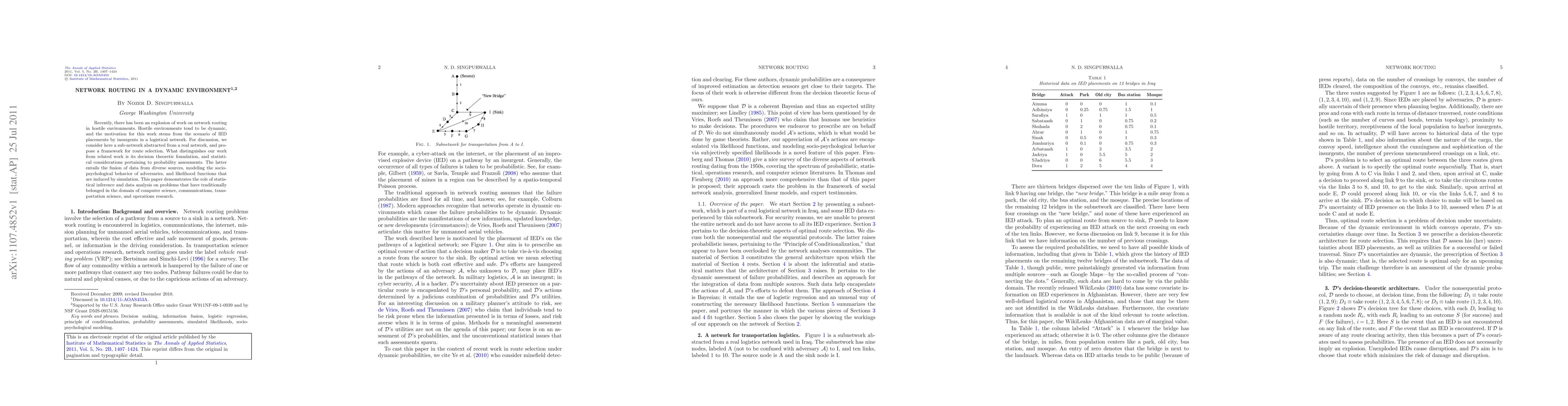 This paper introduces a decision-theoretic framework for network route selection in dynamic, hostile environments like those with IED threats. It emphasizes statistical inference, data fusion from various sources, and modeling adversary behavior, marking a shift from traditional computer science, communications, transportation, and operations research approaches.