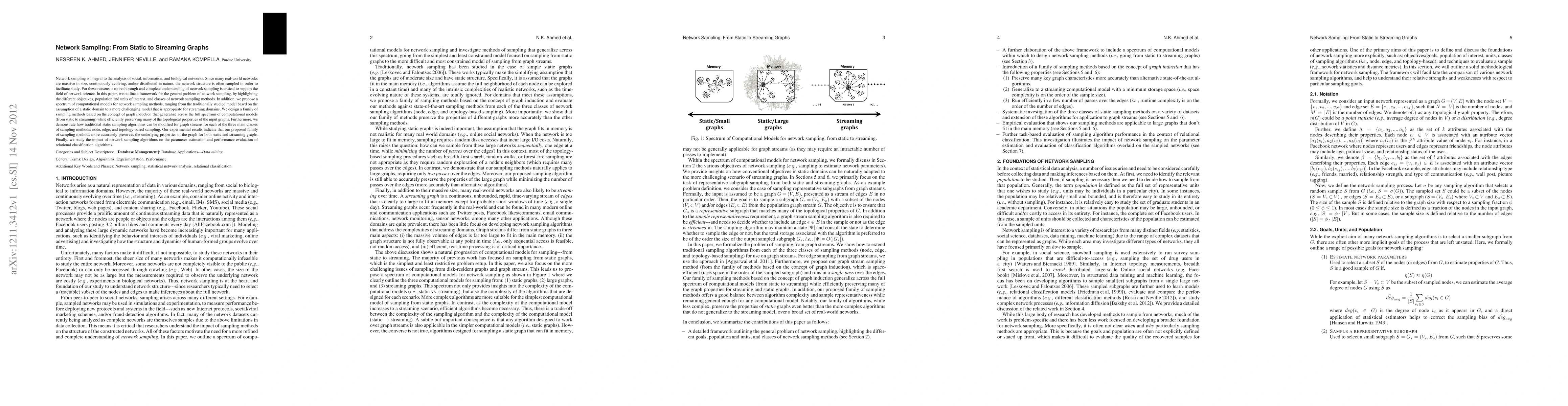 This paper presents a comprehensive framework for network sampling, categorizing objectives, populations, and methods. It introduces a spectrum of computational models, from static to streaming, and proposes a family of sampling methods based on graph induction. The methods efficiently preserve topological properties and outperform traditional algorithms in both static and streaming graphs. The research also explores the impact of these sampling algorithms on relational classification performance.