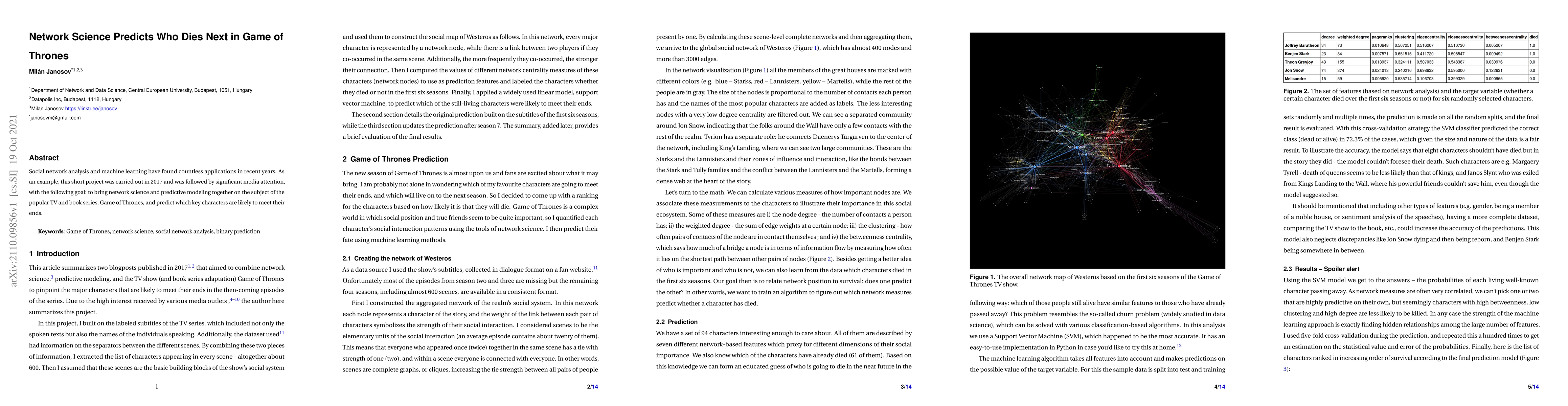 Social network analysis and machine learning have found countless applications in recent years. As an example, this short project was carried out in 2017 and was followed by some media attention, with the following goal: to bring network science and predictive modeling together on the subject of the popular TV and book series, Game of Thrones, and predict which key characters are likely to meet their ends.