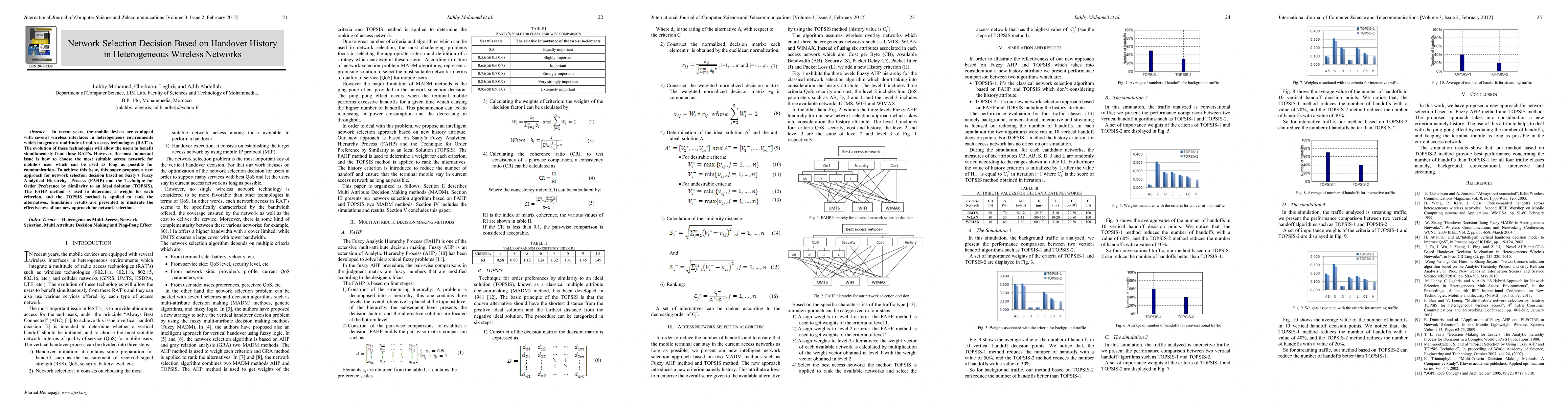 In recent years, the mobile devices are equipped with several wireless interfaces in heterogeneous environments which integrate a multitude of radio access technologies (RAT's). The evolution of these technologies will allow the users to benefit simultaneously from these RAT's. However, the most important issue is how to choose the most suitable access network for mobile's user which can be used as long as possible for communication. To achieve this issue, this paper proposes a new approach for network selection decision based on Saaty's Fuzzy Analytical Hierarchy Process (FAHP) and the Technique for Order Preference by Similarity to an Ideal Solution (TOPSIS). The FAHP method is used to determine a weight for each criterion, and the TOPSIS method is applied to rank the alternatives. Simulation results are presented to illustrate the effectiveness of our new approach for network selection.