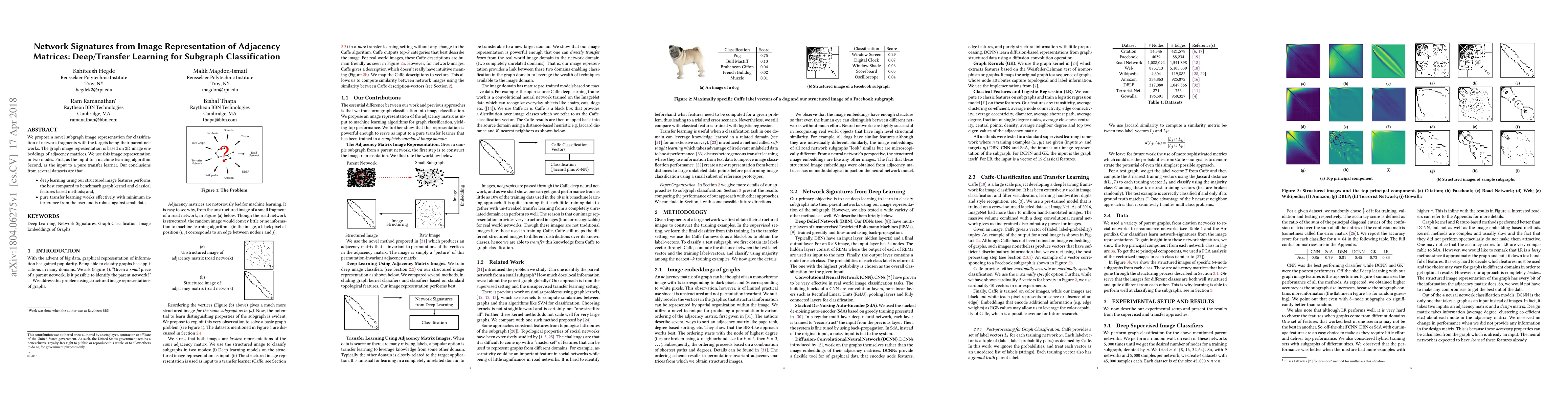 We propose a novel subgraph image representation for classification of network fragments with the targets being their parent networks. The graph image representation is based on 2D image embeddings of adjacency matrices. We use this image representation in two modes. First, as the input to a machine learning algorithm. Second, as the input to a pure transfer learner. Our conclusions from several datasets are that (a) deep learning using our structured image features performs the best compared to benchmark graph kernel and classical features based methods; and, (b) pure transfer learning works effectively with minimum interference from the user and is robust against small data.