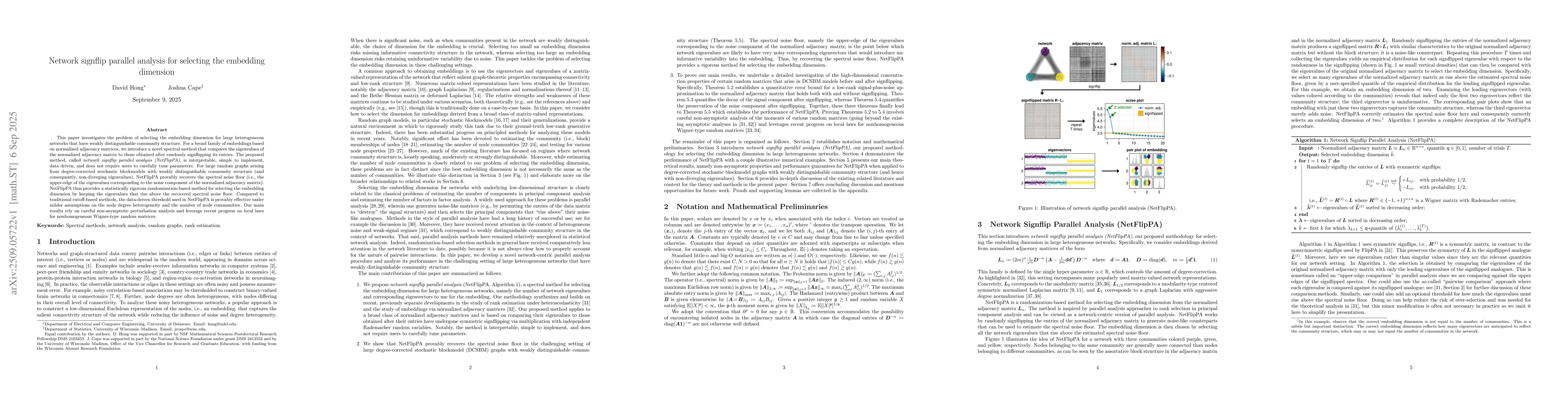 This paper investigates the problem of selecting the embedding dimension for large heterogeneous networks that have weakly distinguishable community structure. For a broad family of embeddings based on normalized adjacency matrices, we introduce a novel spectral method that compares the eigenvalues of the normalized adjacency matrix to those obtained after randomly signflipping its entries. The proposed method, called network signflip parallel analysis (NetFlipPA), is interpretable, simple to implement, data driven, and does not require users to carefully tune parameters. For large random graphs arising from degree-corrected stochastic blockmodels with weakly distinguishable community structure (and consequently, non-diverging eigenvalues), NetFlipPA provably recovers the spectral noise floor (i.e., the upper-edge of the eigenvalues corresponding to the noise component of the normalized adjacency matrix). NetFlipPA thus provides a statistically rigorous randomization-based method for selecting the embedding dimension by keeping the eigenvalues that rise above the recovered spectral noise floor. Compared to traditional cutoff-based methods, the data-driven threshold used in NetFlipPA is provably effective under milder assumptions on the node degree heterogeneity and the number of node communities. Our main results rely on careful non-asymptotic perturbation analysis and leverage recent progress on local laws for nonhomogeneous Wigner-type random matrices.