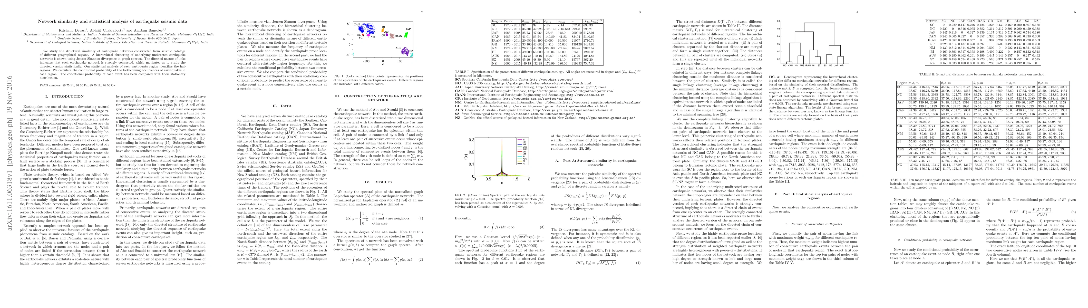 This paper investigates the structural similarity of earthquake networks from different geographical regions using hierarchical clustering and Jensen-Shannon divergence. It statistically analyzes the directed nature of these networks to identify hub regions and calculate the conditional probability of future earthquake occurrences, comparing these probabilities with their stationary distributions.