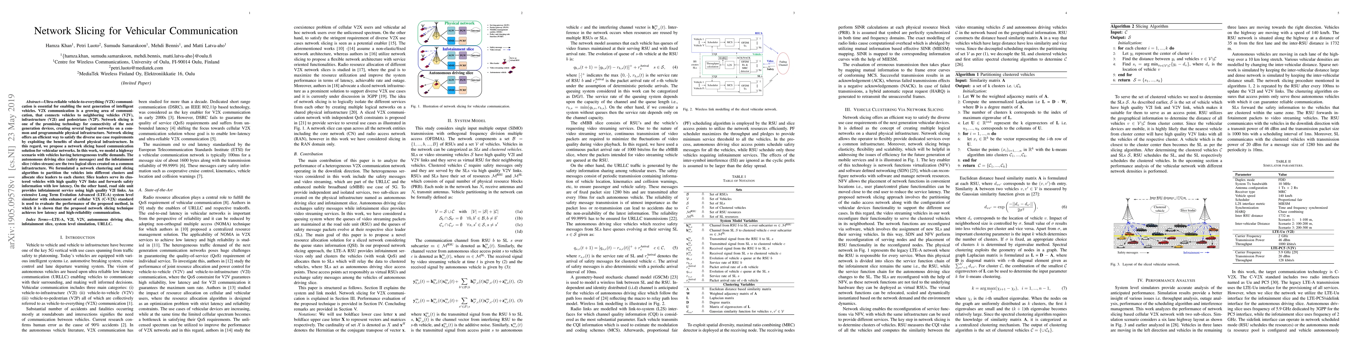 Ultra-reliable vehicle-to-everything (V2X) communication is essential for enabling the next generation of intelligent vehicles. V2X communication is a growing area of communication, that connects vehicles to neighboring vehicles (V2V), infrastructure (V2I) and pedestrians (V2P). Network slicing is one of the promising technology for connectivity of the next generation devices, creating several logical networks on a common and programmable physical infrastructure. Network slicing offers an efficient way to satisfy the diverse use case requirements by exploiting the benefits of shared physical infrastructure. In this regard, we propose a network slicing based communication solution for vehicular networks. In this work, we model a highway scenario with vehicles having heterogeneous traffic demands. The autonomous driving slice (safety messages) and the infotainment slice (video stream) are the two logical slices created on a common infrastructure. We formulated a network clustering and slicing algorithm to partition the vehicles into different clusters and allocate slice leaders to each cluster. Slice leaders serve its clustered vehicles with high quality V2V links and forwards safety information with low latency. On the other hand, road side unit provides infotainment service using high quality V2I links. An extensive Long Term Evolution Advanced (LTE-A) system level simulator with enhancement of cellular V2X (C-V2X) standard is used to evaluate the performance of the proposed method, in which it is shown that the proposed network slicing technique achieves low latency and high-reliability communication.