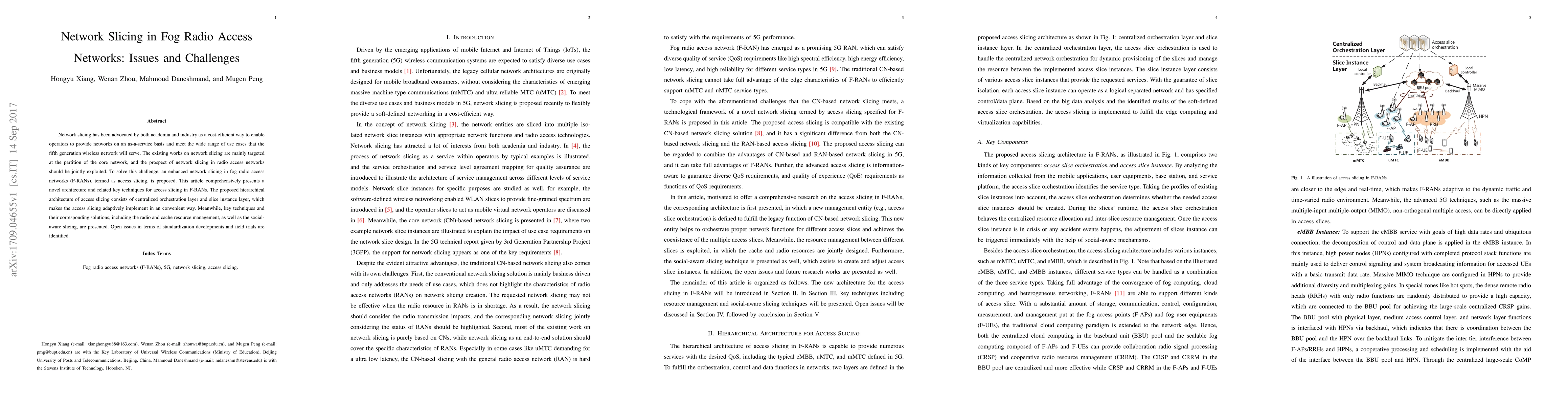 This paper proposes a novel architecture for network slicing in fog radio access networks (F-RANs) termed access slicing, featuring a centralized orchestration layer and slice instance layer. It also discusses key techniques like radio and cache resource management, and identifies open issues in standardization and field trials.