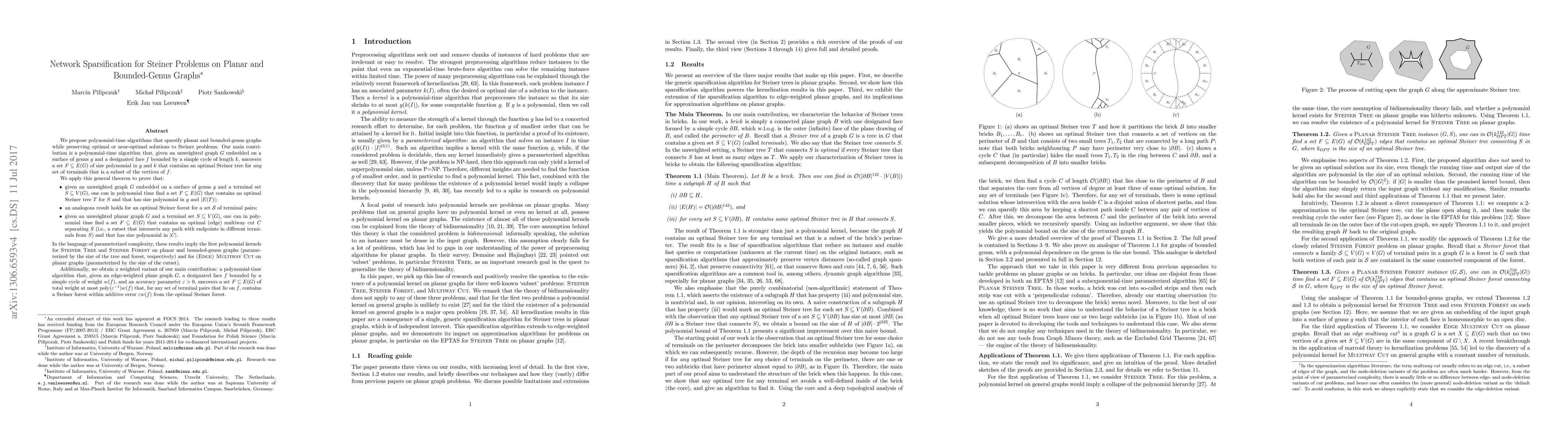 This paper introduces polynomial-time algorithms for sparsifying planar and bounded-genus graphs that preserve optimal or near-optimal solutions for Steiner problems. It presents a method to find a small set of edges containing an optimal Steiner tree or forest, leading to the first polynomial kernels for these problems in planar and bounded-genus graphs.