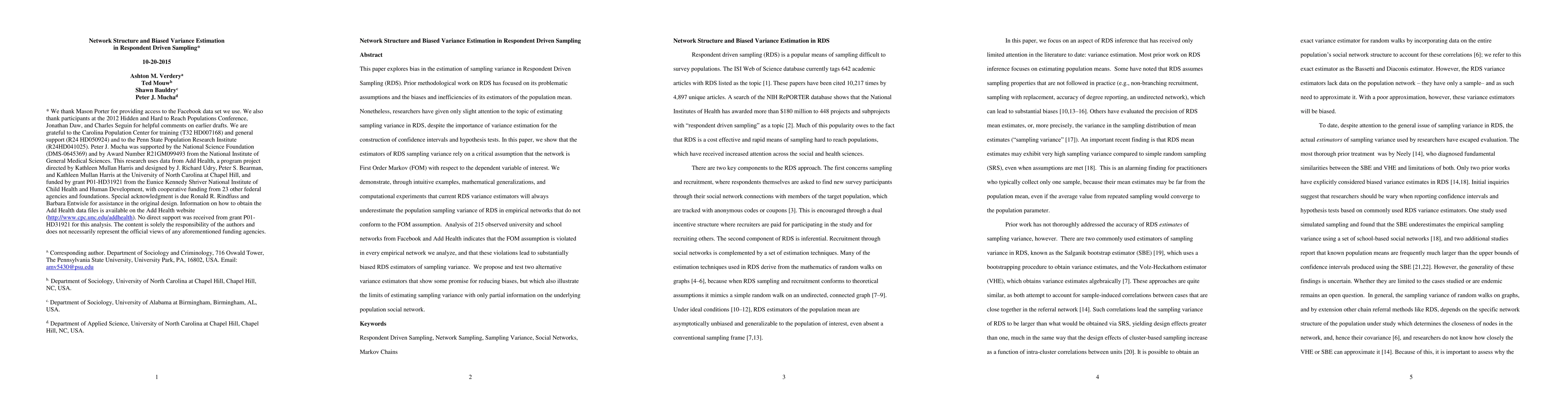 This paper identifies bias in variance estimation in Respondent Driven Sampling (RDS) due to the critical First Order Markov assumption, showing that current estimators consistently underestimate variance in non-conforming networks. Proposed alternatives show potential but highlight the challenges of variance estimation with limited network information.