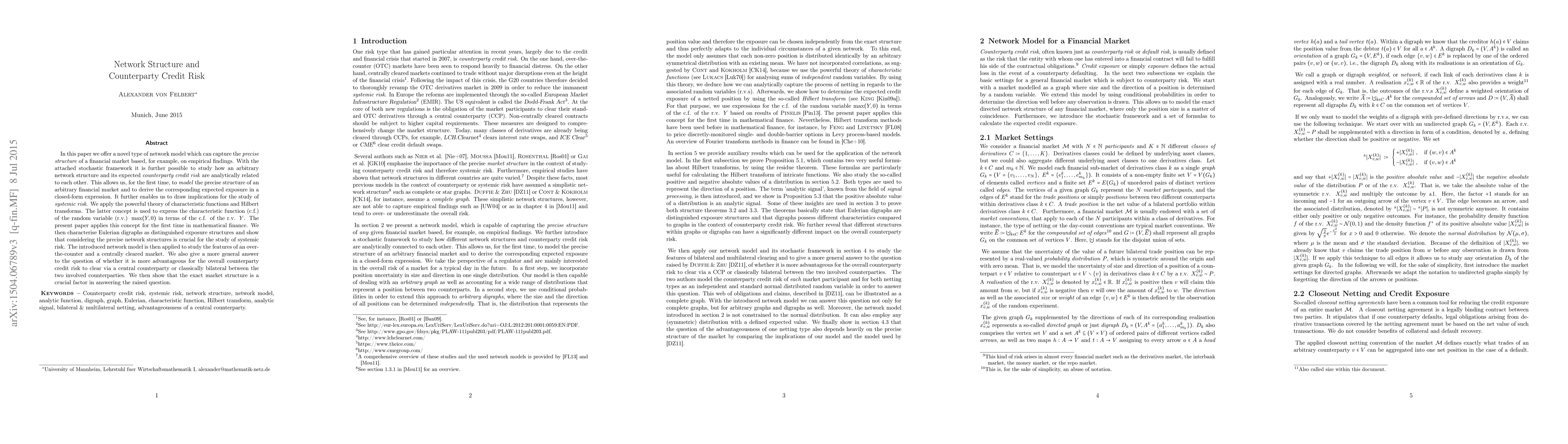 In this paper we offer a novel type of network model which can capture the precise structure of a financial market based, for example, on empirical findings. With the attached stochastic framework it is further possible to study how an arbitrary network structure and its expected counterparty credit risk are analytically related to each other. This allows us, for the first time, to model the precise structure of an arbitrary financial market and to derive the corresponding expected exposure in a closed-form expression. It further enables us to draw implications for the study of systemic risk. We apply the powerful theory of characteristic functions and Hilbert transforms. The latter concept is used to express the characteristic function (c.f.) of the random variable (r.v.) $\max(Y, 0)$ in terms of the c.f. of the r.v. $Y$. The present paper applies this concept for the first time in mathematical finance. We then characterise Eulerian digraphs as distinguished exposure structures and show that considering the precise network structures is crucial for the study of systemic risk. The introduced network model is then applied to study the features of an over-the-counter and a centrally cleared market. We also give a more general answer to the question of whether it is more advantageous for the overall counterparty credit risk to clear via a central counterparty or classically bilateral between the two involved counterparties. We then show that the exact market structure is a crucial factor in answering the raised question.