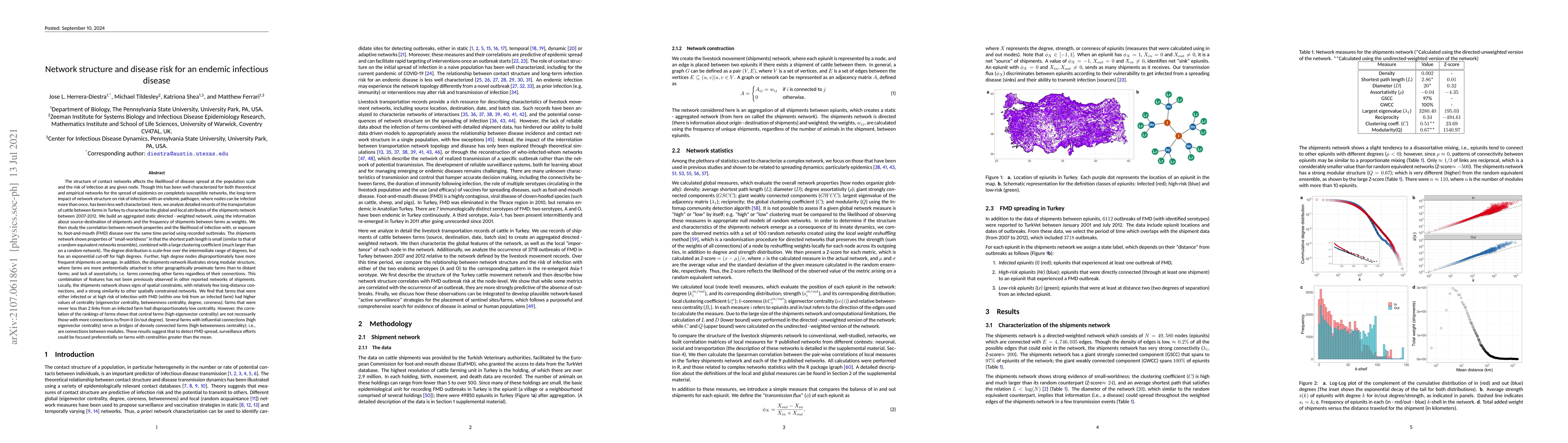 The structure of contact networks affects the likelihood of disease spread at the population scale and the risk of infection at any given node. Though this has been well characterized for both theoretical and empirical networks for the spread of epidemics on completely susceptible networks, the long-term impact of network structure on risk of infection with an endemic pathogen has been less well characterized. Here, we analyze detailed records of the transportation of cattle between farms in Turkey to characterize the global and local attributes of the shipments network between 2007-2012, building an aggregated static directed - weighted network. We study the correlation between network properties and the likelihood of infection with, or exposure to, foot-and-mouth (FMD) disease over the same time period using recorded outbreaks. The shipments network shows properties of small-worldness and scale-freeness (intermediate degrees), with an exponential cut-off for high degrees. The shipments network illustrates strong modularity and lack of assortativity. The shipments network shows signs of spatial constraints, with few long-distance connections, and a strong similarity to other spatially constrained networks. We find that farms that were either infected or at high risk of infection with FMD (within one link from an infected farm) had higher values of centrality; farms that were never less than 2 links from an infected farm had disproportionately low centrality. However, the correlation of the rankings of farms shows that central farms (high eigenvector centrality) are not necessarily those with more connections to/from it (in/out degree). Several central farms serve as bridges of densely connected farms (high betweenness centrality). These results suggest that to detect FMD spread, surveillance efforts could be focused preferentially on farms with centralities greater than the mean.