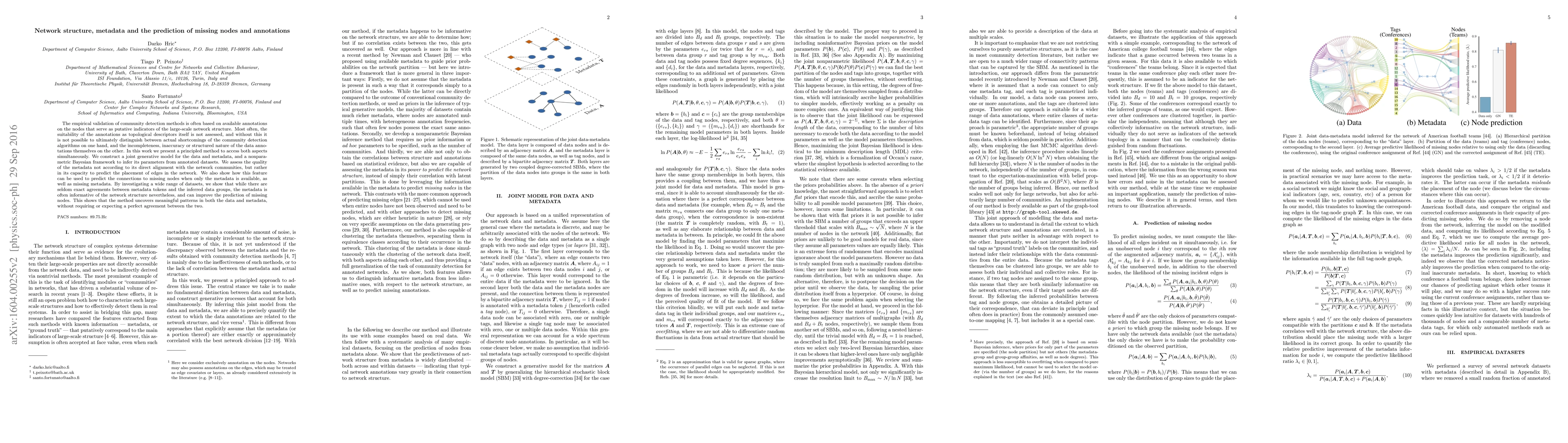 The empirical validation of community detection methods is often based on available annotations on the nodes that serve as putative indicators of the large-scale network structure. Most often, the suitability of the annotations as topological descriptors itself is not assessed, and without this it is not possible to ultimately distinguish between actual shortcomings of the community detection algorithms on one hand, and the incompleteness, inaccuracy or structured nature of the data annotations themselves on the other. In this work we present a principled method to access both aspects simultaneously. We construct a joint generative model for the data and metadata, and a nonparametric Bayesian framework to infer its parameters from annotated datasets. We assess the quality of the metadata not according to its direct alignment with the network communities, but rather in its capacity to predict the placement of edges in the network. We also show how this feature can be used to predict the connections to missing nodes when only the metadata is available, as well as missing metadata. By investigating a wide range of datasets, we show that while there are seldom exact agreements between metadata tokens and the inferred data groups, the metadata is often informative of the network structure nevertheless, and can improve the prediction of missing nodes. This shows that the method uncovers meaningful patterns in both the data and metadata, without requiring or expecting a perfect agreement between the two.