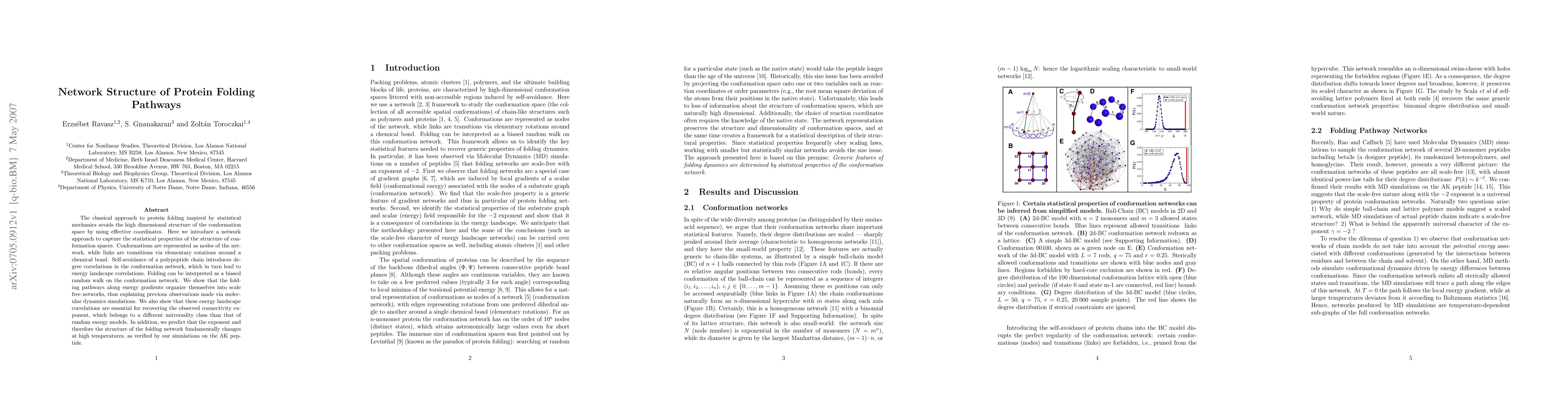 The classical approach to protein folding inspired by statistical mechanics avoids the high dimensional structure of the conformation space by using effective coordinates. Here we introduce a network approach to capture the statistical properties of the structure of conformation spaces. Conformations are represented as nodes of the network, while links are transitions via elementary rotations around a chemical bond. Self-avoidance of a polypeptide chain introduces degree correlations in the conformation network, which in turn lead to energy landscape correlations. Folding can be interpreted as a biased random walk on the conformation network. We show that the folding pathways along energy gradients organize themselves into scale free networks, thus explaining previous observations made via molecular dynamics simulations. We also show that these energy landscape correlations are essential for recovering the observed connectivity exponent, which belongs to a different universality class than that of random energy models. In addition, we predict that the exponent and therefore the structure of the folding network fundamentally changes at high temperatures, as verified by our simulations on the AK peptide.