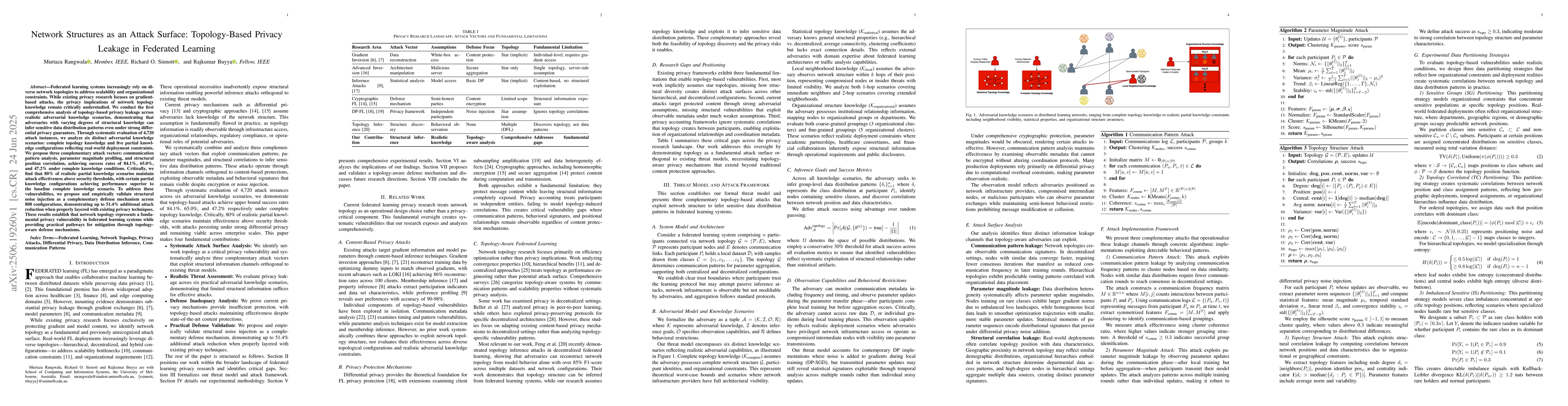 Federated learning systems increasingly rely on diverse network topologies to address scalability and organizational constraints. While existing privacy research focuses on gradient-based attacks, the privacy implications of network topology knowledge remain critically understudied. We conduct the first comprehensive analysis of topology-based privacy leakage across realistic adversarial knowledge scenarios, demonstrating that adversaries with varying degrees of structural knowledge can infer sensitive data distribution patterns even under strong differential privacy guarantees. Through systematic evaluation of 4,720 attack instances, we analyze six distinct adversarial knowledge scenarios: complete topology knowledge and five partial knowledge configurations reflecting real-world deployment constraints. We propose three complementary attack vectors: communication pattern analysis, parameter magnitude profiling, and structural position correlation, achieving success rates of 84.1%, 65.0%, and 47.2% under complete knowledge conditions. Critically, we find that 80% of realistic partial knowledge scenarios maintain attack effectiveness above security thresholds, with certain partial knowledge configurations achieving performance superior to the baseline complete knowledge scenario. To address these vulnerabilities, we propose and empirically validate structural noise injection as a complementary defense mechanism across 808 configurations, demonstrating up to 51.4% additional attack reduction when properly layered with existing privacy techniques. These results establish that network topology represents a fundamental privacy vulnerability in federated learning systems while providing practical pathways for mitigation through topology-aware defense mechanisms.
