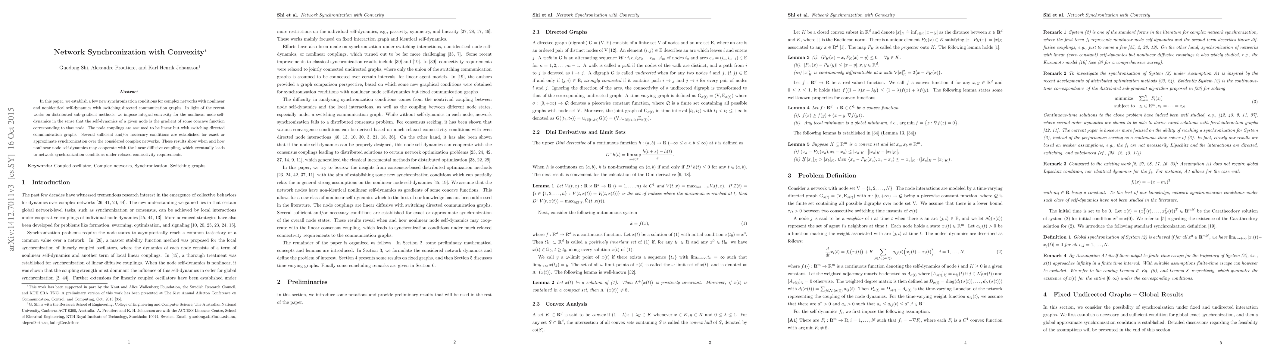 In this paper, we establish a few new synchronization conditions for complex networks with nonlinear and nonidentical self-dynamics with switching directed communication graphs. In light of the recent works on distributed sub-gradient methods, we impose integral convexity for the nonlinear node self-dynamics in the sense that the self-dynamics of a given node is the gradient of some concave function corresponding to that node. The node couplings are assumed to be linear but with switching directed communication graphs. Several sufficient and/or necessary conditions are established for exact or approximate synchronization over the considered complex networks. These results show when and how nonlinear node self-dynamics may cooperate with the linear diffusive coupling, which eventually leads to network synchronization conditions under relaxed connectivity requirements.