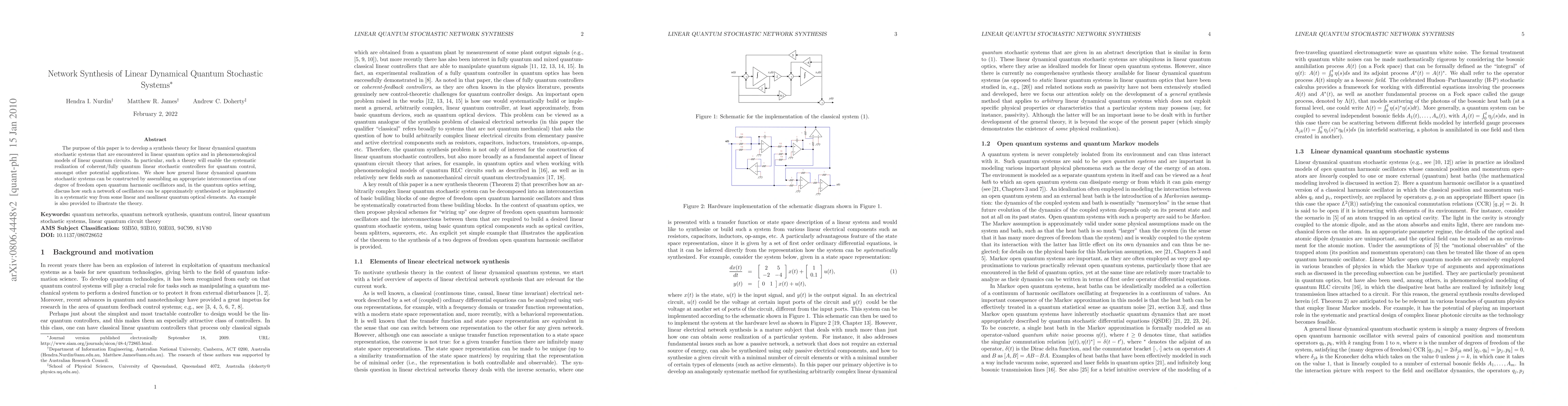 This paper develops a synthesis theory for linear dynamical quantum stochastic systems, enabling the construction of quantum stochastic controllers for quantum control applications. It demonstrates how these systems can be built from interconnected quantum harmonic oscillators and discusses their implementation in quantum optics.