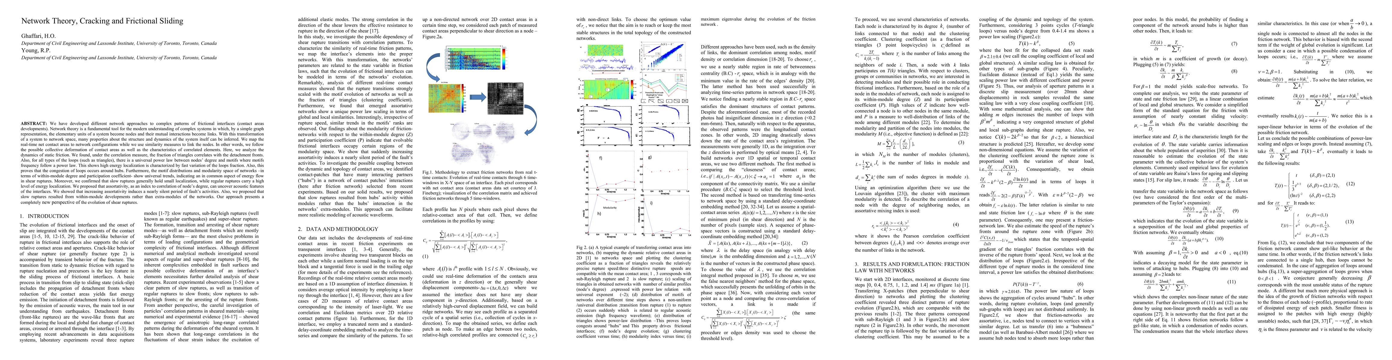 We have developed different network approaches to complex patterns of frictional interfaces (contact areas developments). Here, we analyze the dynamics of static friction. We found, under the correlation measure, the fraction of triangles correlates with the detachment fronts. Also, for all types of the loops (such as triangles), there is a universal power law between nodes' degree and motifs where motifs frequency follow a power law. This shows high energy localization is characterized by fast variation of the loops fraction. Also, this proves that the congestion of loops occurs around hubs. Furthermore, the motif distributions and modularity space of networks -in terms of within-module degree and participation coefficient- show universal trends, indicating an in common aspect of energy flow in shear ruptures. Moreover, we confirmed that slow ruptures generally hold small localization, while regular ruptures carry a high level of energy localization. We proposed that assortativity, as an index to correlation of node's degree, can uncover acoustic features of the interfaces. We showed that increasing assortativity induces a nearly silent period of fault's activities. Also, we proposed that slow ruptures resulted from within-module developments rather than extra-modules of the networks. Our approach presents a completely new perspective of the evolution of shear ruptures.