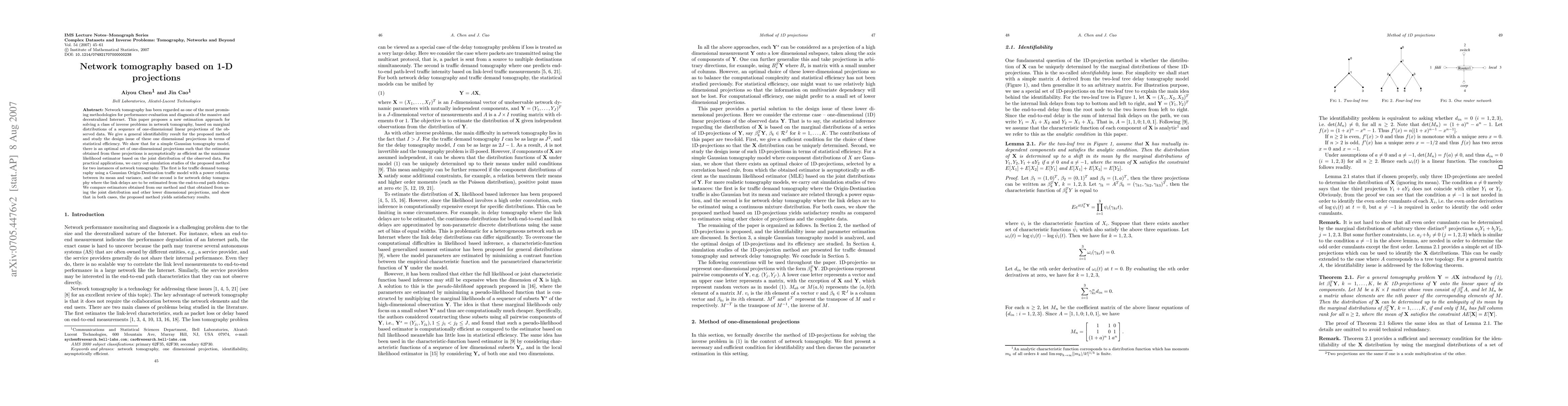 Network tomography has been regarded as one of the most promising methodologies for performance evaluation and diagnosis of the massive and decentralized Internet. This paper proposes a new estimation approach for solving a class of inverse problems in network tomography, based on marginal distributions of a sequence of one-dimensional linear projections of the observed data. We give a general identifiability result for the proposed method and study the design issue of these one dimensional projections in terms of statistical efficiency. We show that for a simple Gaussian tomography model, there is an optimal set of one-dimensional projections such that the estimator obtained from these projections is asymptotically as efficient as the maximum likelihood estimator based on the joint distribution of the observed data. For practical applications, we carry out simulation studies of the proposed method for two instances of network tomography. The first is for traffic demand tomography using a Gaussian Origin-Destination traffic model with a power relation between its mean and variance, and the second is for network delay tomography where the link delays are to be estimated from the end-to-end path delays. We compare estimators obtained from our method and that obtained from using the joint distribution and other lower dimensional projections, and show that in both cases, the proposed method yields satisfactory results.
