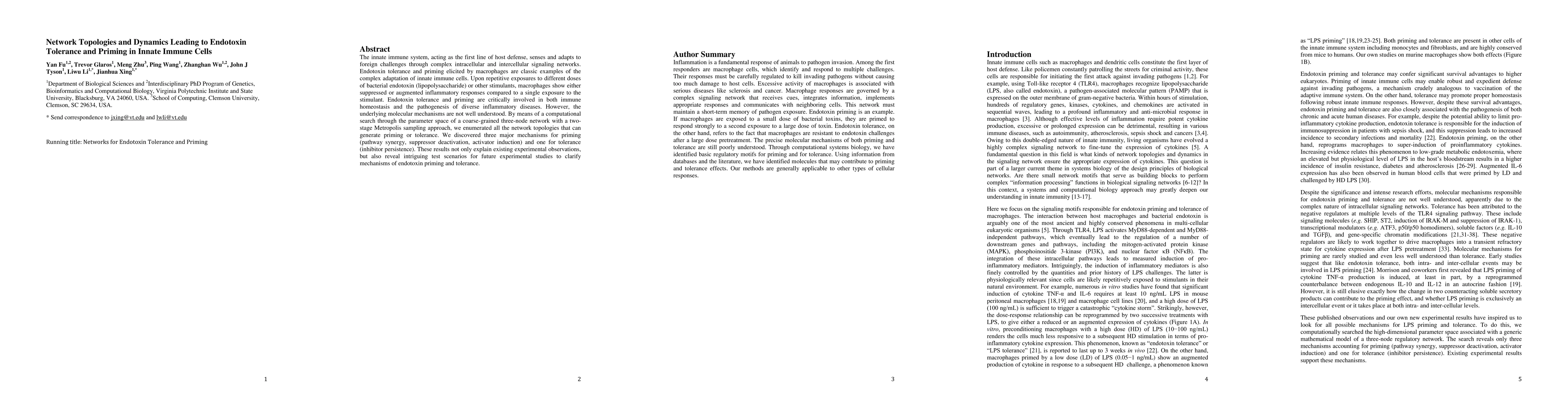 The innate immune system, acting as the first line of host defense, senses and adapts to foreign challenges through complex intracellular and intercellular signaling networks. Endotoxin tolerance and priming elicited by macrophages are classic examples of the complex adaptation of innate immune cells. Upon repetitive exposures to different doses of bacterial endotoxin (lipopolysaccharide) or other stimulants, macrophages show either suppressed or augmented inflammatory responses compared to a single exposure to the stimulant. Endotoxin tolerance and priming are critically involved in both immune homeostasis and the pathogenesis of diverse inflammatory diseases. However, the underlying molecular mechanisms are not well understood. By means of a computational search through the parameter space of a coarse-grained three-node network with a two-stage Metropolis sampling approach, we enumerated all the network topologies that can generate priming or tolerance. We discovered three major mechanisms for priming (pathway synergy, suppressor deactivation, activator induction) and one for tolerance (inhibitor persistence). These results not only explain existing experimental observations, but also reveal intriguing test scenarios for future experimental studies to clarify mechanisms of endotoxin priming and tolerance.