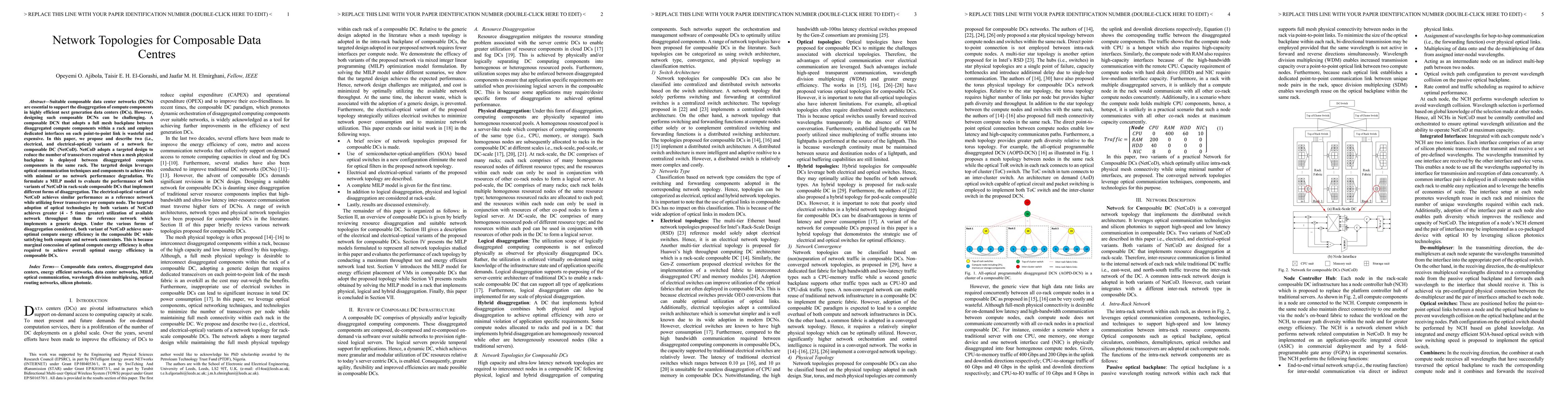 This paper proposes two variants of a network topology (electrical and electrical-optical) for composable data centers to efficiently support disaggregated compute components. The proposed NetCoD design reduces transceiver usage and achieves greater network throughput utilization compared to generic designs, while maintaining near-optimal compute energy efficiency.