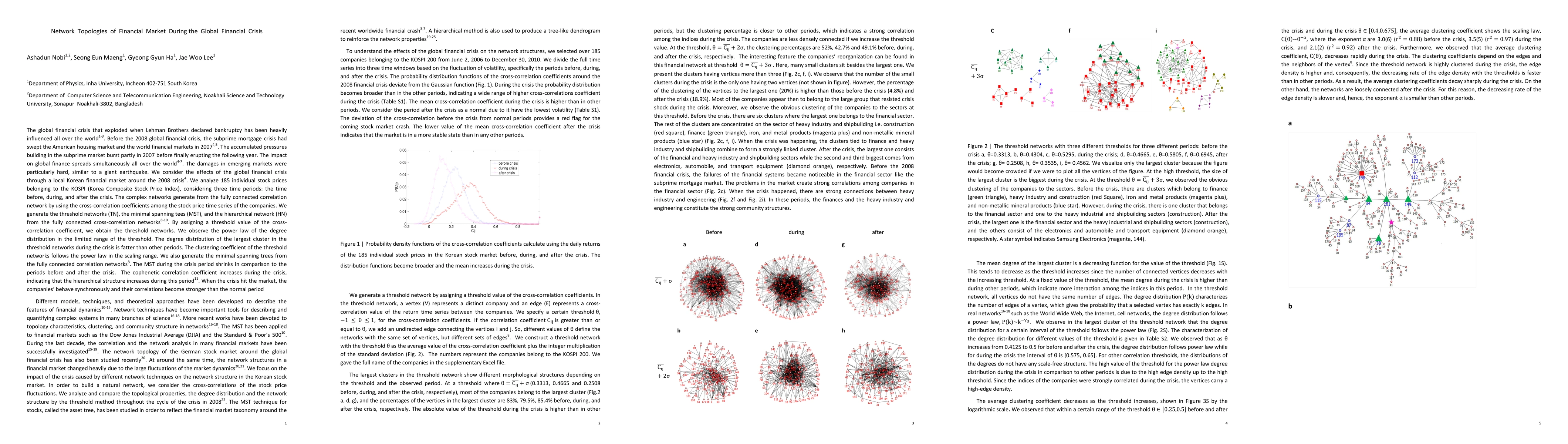 We consider the effects of the global financial crisis through a local Korean financial market around the 2008 crisis. We analyze 185 individual stock prices belonging to the KOSPI (Korea Composite Stock Price Index), cosidering three time periods: the time before, during, and after the crisis. The complex networks generate from the fully connected correlation network by using the cross-correlation coefficients among the stock price time series of the companies. We generate the threshold networks (TN), the minimal spanning tees (MST), and the hierarchical network (HN) from the fully connected cross-correlation networks. By assigning a threshold value of the cross-correlation coefficient, we obtain the threshold networks. We observe the power law of the degree distribution in the limited range of the threshold. The degree distribution of the largest cluster in the threshold networks during the crisis is fatter than other periods. The clustering coefficient of the threshold networks follows the power law in the scaling range. We also generate the minimal spanning trees from the fully connected correlation networks. The MST during the crisis period shrinks in comparison to the periods before and after the crisis. The cophenetic correlation coefficient increases during the crisis, indicating that the hierarchical structure increases during this period. When the crisis hit the market, the companies behave synchronously and their correlations become stronger than the normal period.