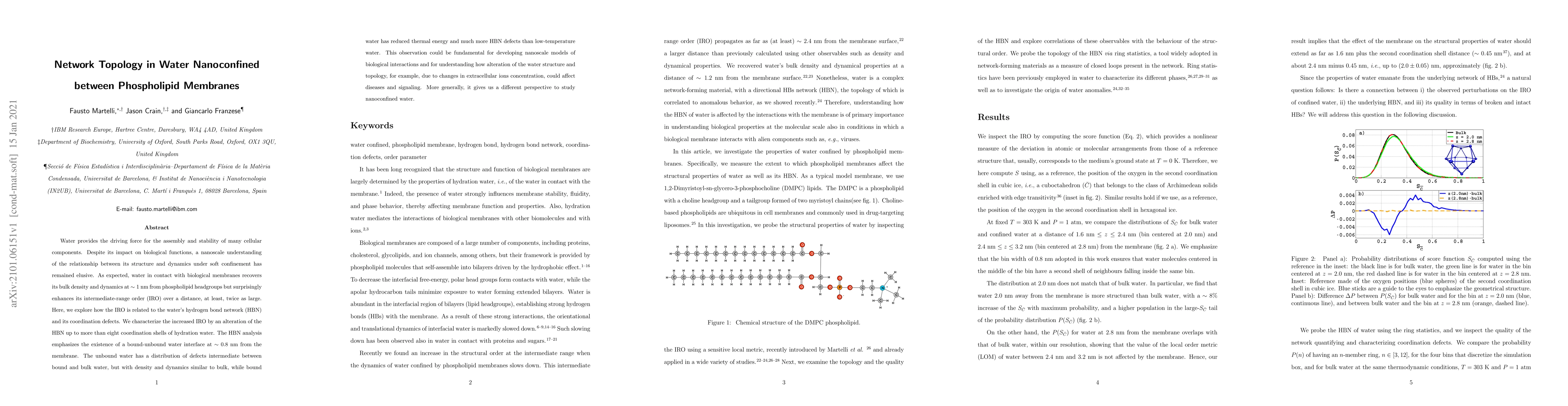 This study reveals that water nanoconfined between phospholipid membranes enhances its intermediate-range order beyond its bulk state, significantly altering the hydrogen bond network up to eight coordination shells. This structural change suggests a bound-unbound water interface, with implications for biological interactions and disease mechanisms.
