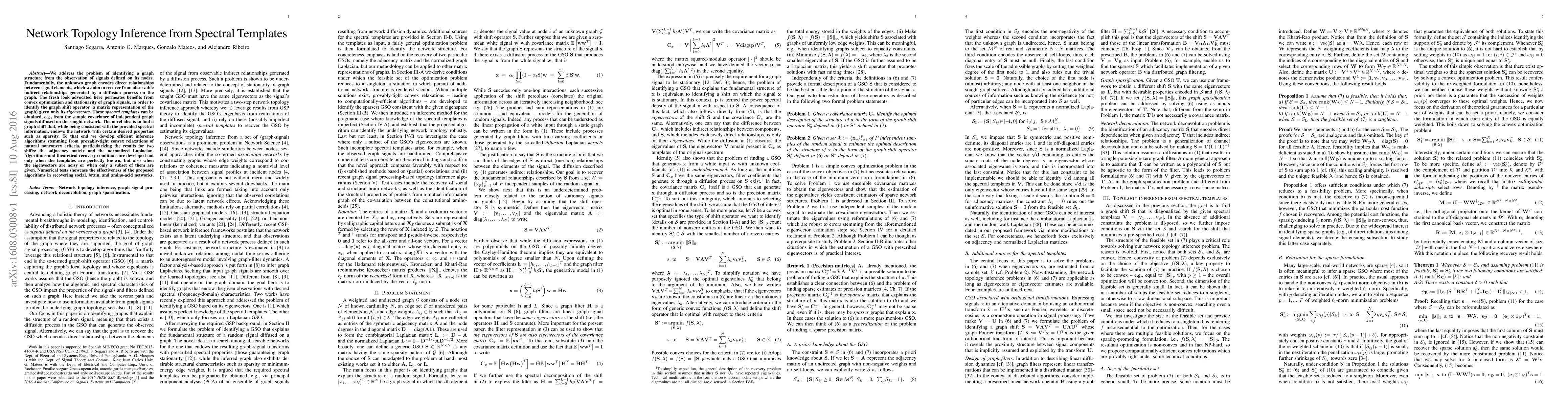 This paper proposes novel algorithms for inferring network topology from spectral templates, leveraging convex optimization and graph signal stationarity to identify the graph shift operator using only its eigenvectors. The developed algorithms efficiently recover desired network properties like sparsity, even under noisy or incomplete eigenvector data, and are validated through successful network recovery in various applications.