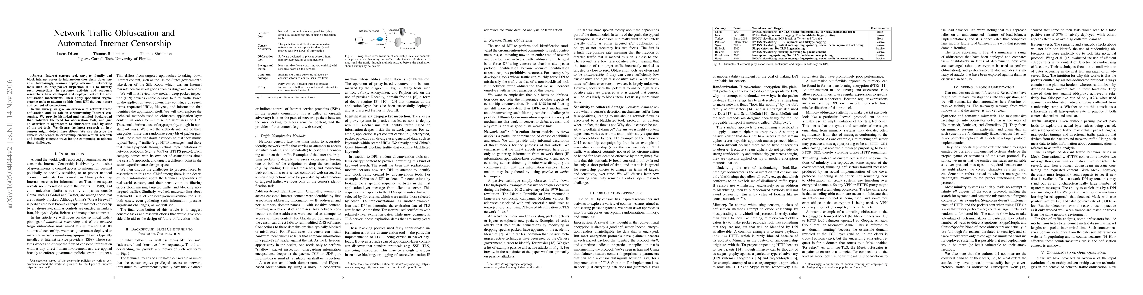 This paper surveys network traffic obfuscation techniques used to circumvent Internet censorship, detailing the historical and technical background of these methods and reviewing the latest research on detection by censors. It also outlines current challenges and proposes actionable solutions for the research community.