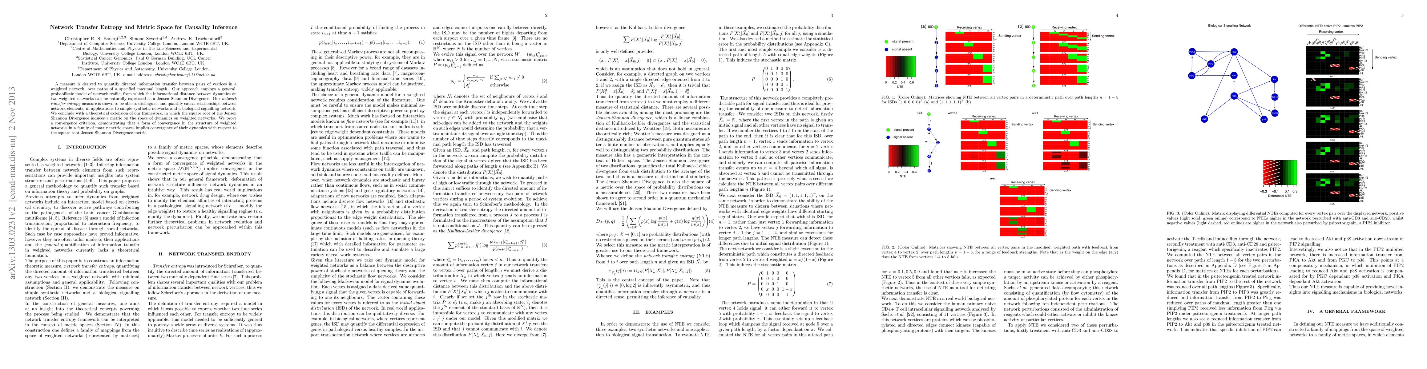 A measure is derived to quantify directed information transfer between pairs of vertices in a weighted network, over paths of a specified maximal length. Our approach employs a general, probabilistic model of network traffic, from which the informational distance between dynamics on two weighted networks can be naturally expressed as a Jensen Shannon Divergence (JSD). Our network transfer entropy measure is shown to be able to distinguish and quantify causal relationships between network elements, in applications to simple synthetic networks and a biological signalling network. We conclude with a theoretical extension of our framework, in which the square root of the JSD induces a metric on the space of dynamics on weighted networks. We prove a convergence criterion, demonstrating that a form of convergence in the structure of weighted networks in a family of matrix metric spaces implies convergence of their dynamics with respect to the square root JSD metric.