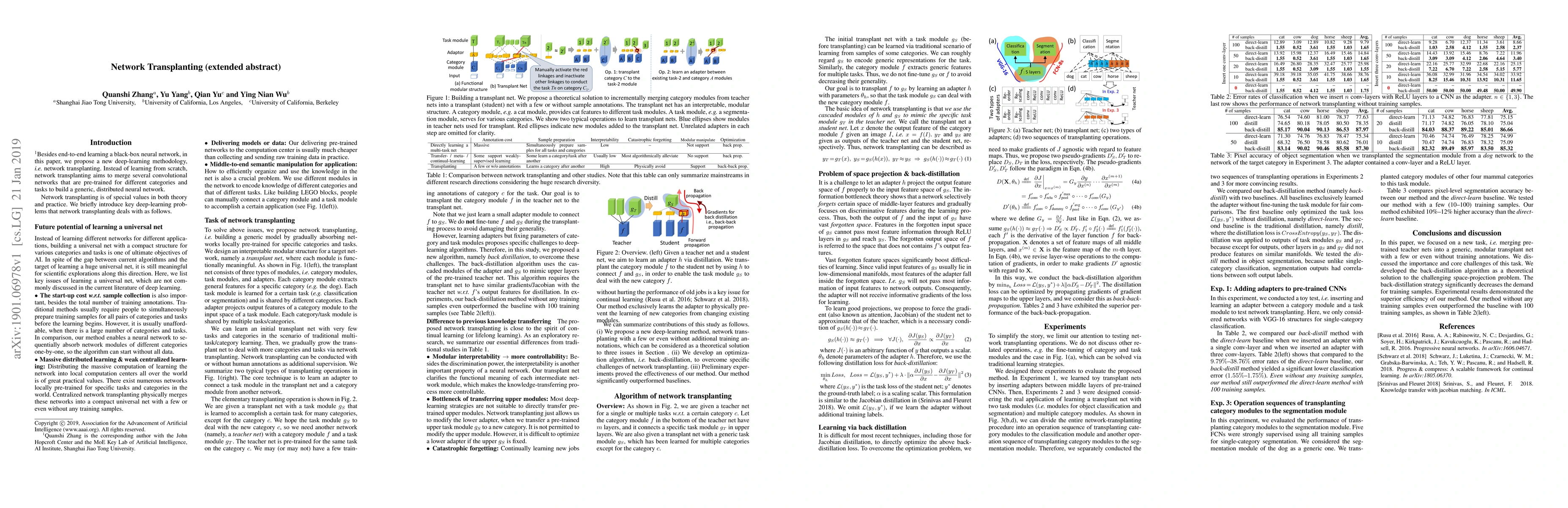 This paper focuses on a new task, i.e., transplanting a category-and-task-specific neural network to a generic, modular network without strong supervision. We design a functionally interpretable structure for the generic network. Like building LEGO blocks, we teach the generic network a new category by directly transplanting the module corresponding to the category from a pre-trained network with a few or even without sample annotations. Our method incrementally adds new categories to the generic network but does not affect representations of existing categories. In this way, our method breaks the typical bottleneck of learning a net for massive tasks and categories, i.e., the requirement of collecting samples for all tasks and categories at the same time before the learning begins. Thus, we use a new distillation algorithm, namely back-distillation, to overcome specific challenges of network transplanting. Our method without training samples even outperformed the baseline with 100 training samples.