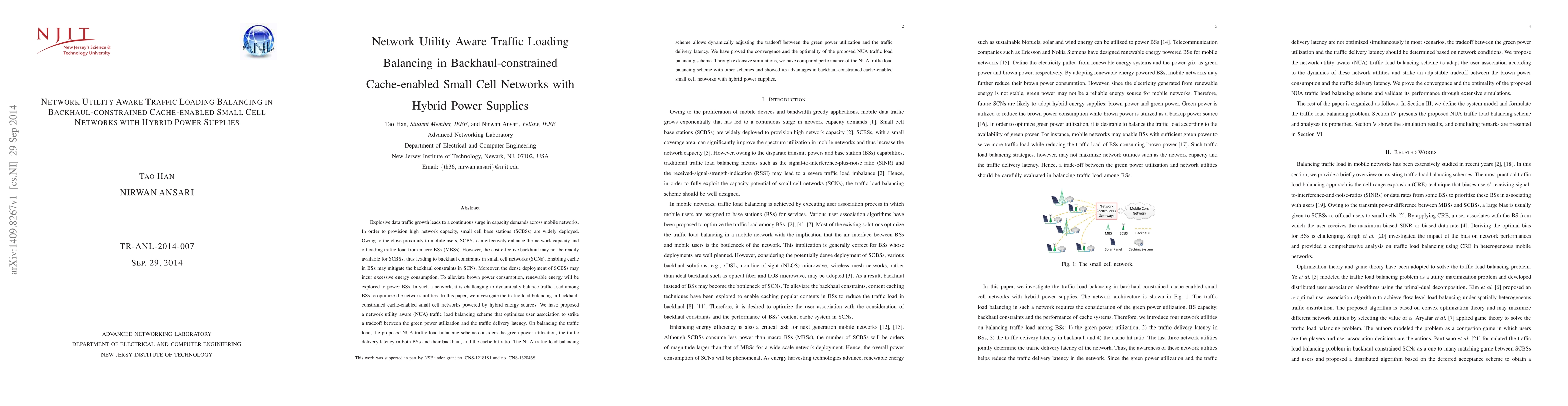 This paper proposes a network utility aware (NUA) traffic load balancing scheme for backhaul-constrained cache-enabled small cell networks powered by hybrid energy sources. The scheme optimizes user association to balance the trade-off between green power utilization and traffic delivery latency, demonstrating convergence and optimality through simulations.