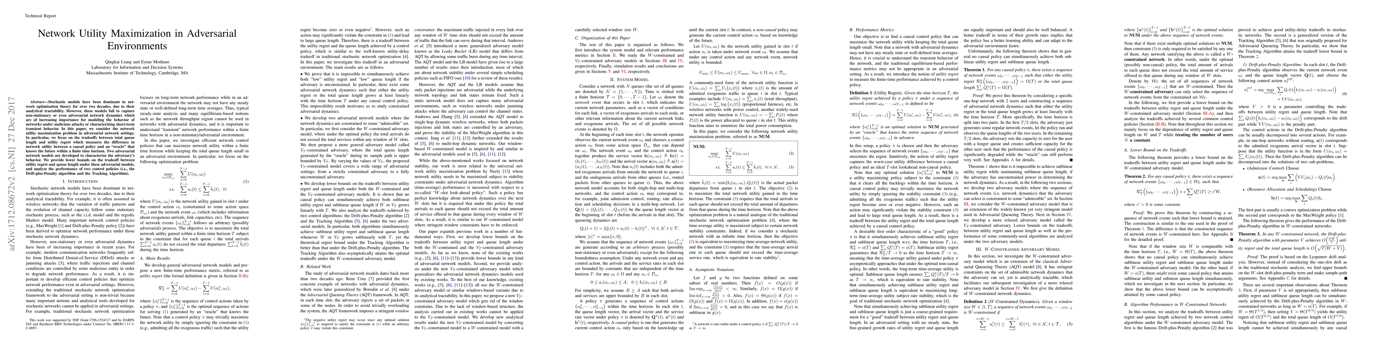 This paper explores network utility maximization in adversarial environments, focusing on the tradeoff between total queue length and utility regret. It develops two adversarial network models to characterize adversarial behavior, and analyzes the performance of two control policies under these models.