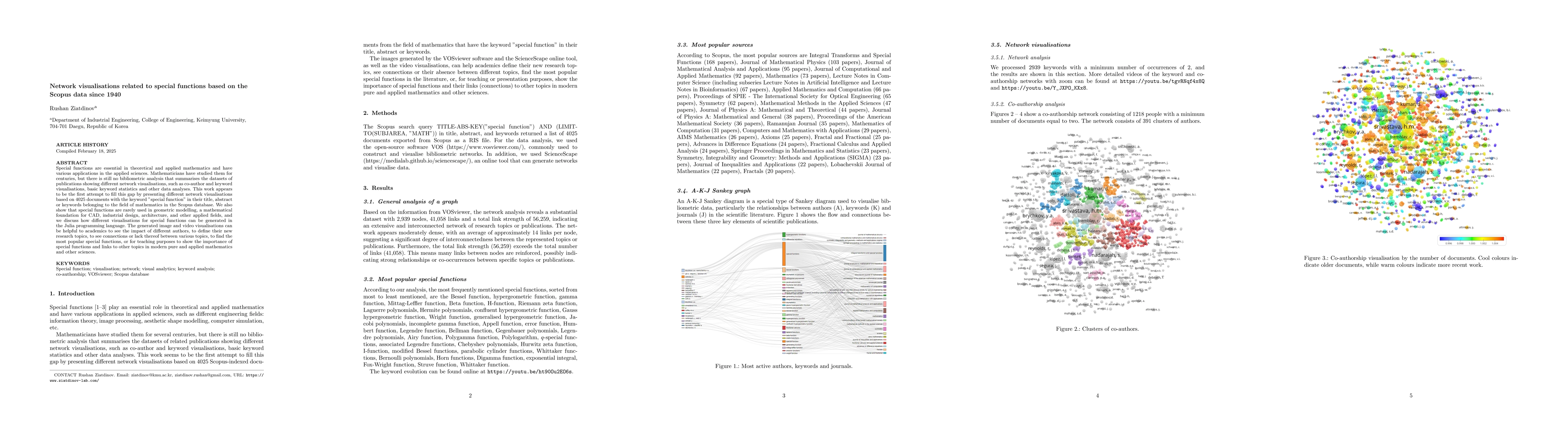 This research analyzes network visualizations related to special functions using 4025 documents from the Scopus database with the keyword 'special function'. It presents co-authorship networks, keyword visualizations, and basic keyword statistics.