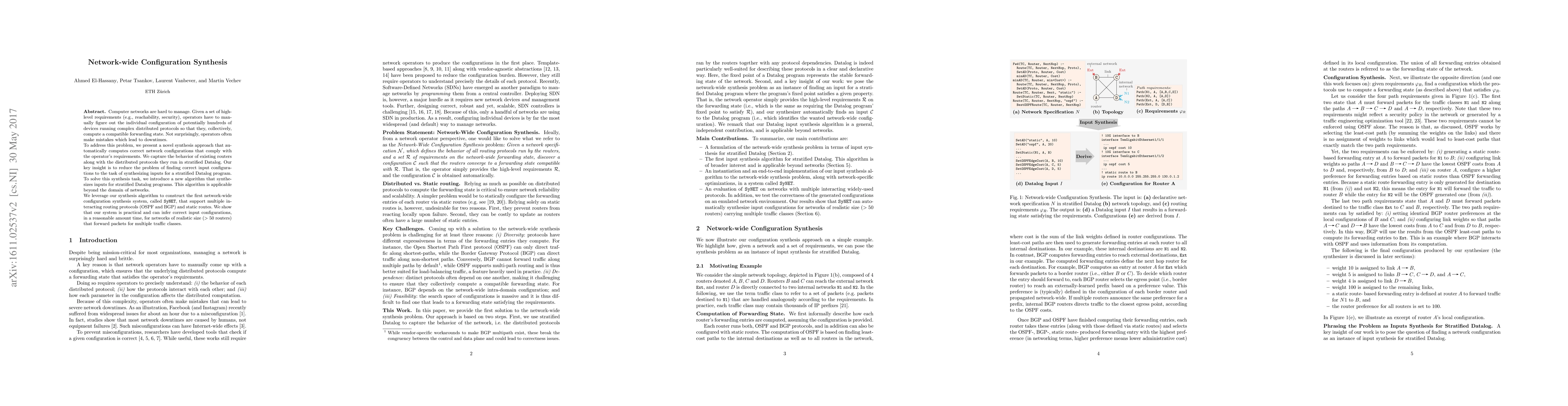 Computer networks are hard to manage. Given a set of high-level requirements (e.g., reachability, security), operators have to manually figure out the individual configuration of potentially hundreds of devices running complex distributed protocols so that they, collectively, compute a compatible forwarding state. Not surprisingly, operators often make mistakes which lead to downtimes. To address this problem, we present a novel synthesis approach that automatically computes correct network configurations that comply with the operator's requirements. We capture the behavior of existing routers along with the distributed protocols they run in stratified Datalog. Our key insight is to reduce the problem of finding correct input configurations to the task of synthesizing inputs for a stratified Datalog program. To solve this synthesis task, we introduce a new algorithm that synthesizes inputs for stratified Datalog programs. This algorithm is applicable beyond the domain of networks. We leverage our synthesis algorithm to construct the first network-wide configuration synthesis system, called SyNET, that support multiple interacting routing protocols (OSPF and BGP) and static routes. We show that our system is practical and can infer correct input configurations, in a reasonable amount time, for networks of realistic size (> 50 routers) that forward packets for multiple traffic classes.