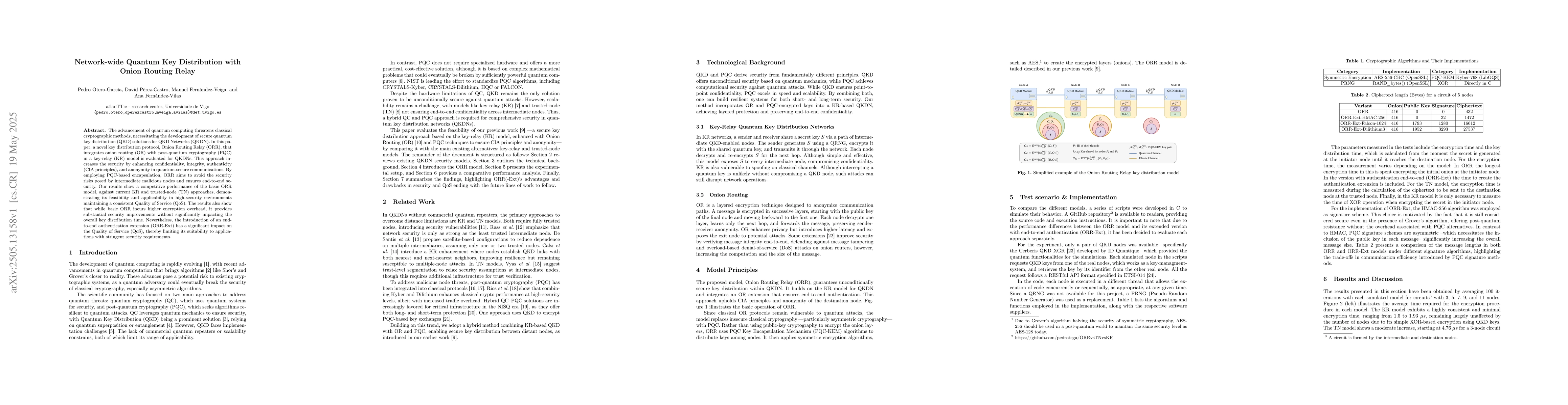 The paper proposes a novel key distribution protocol, Onion Routing Relay (ORR), integrating onion routing with post-quantum cryptography in a key-relay model for QKD Networks.