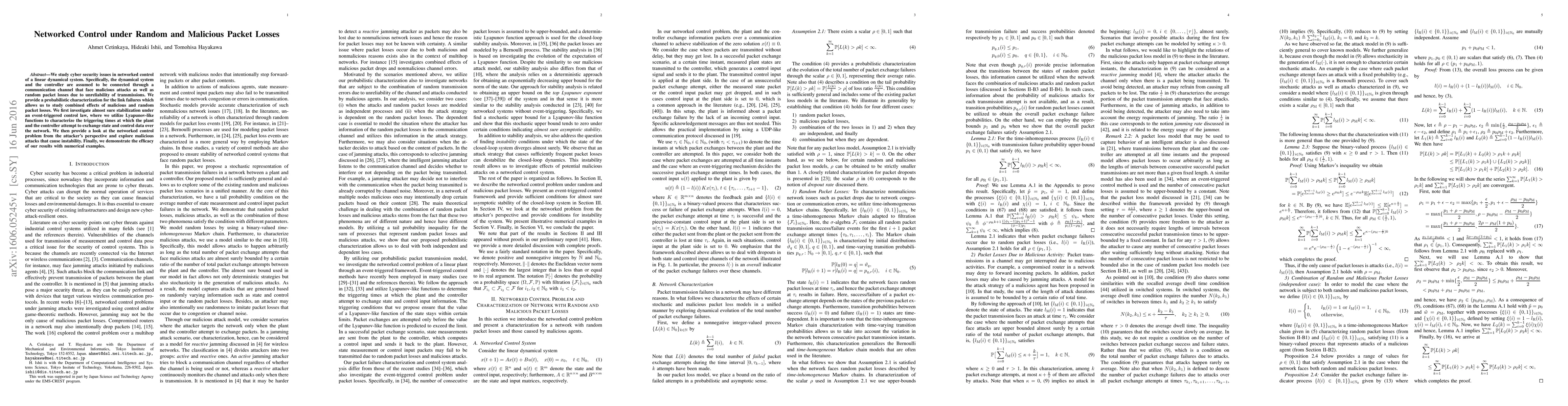 This paper investigates cyber security in networked control systems facing both random and malicious packet losses. It employs probabilistic characterizations to analyze the combined effects of these packet losses and explores stabilization under event-triggered control laws, while also considering malicious attacks that can lead to instability, supported by numerical examples.