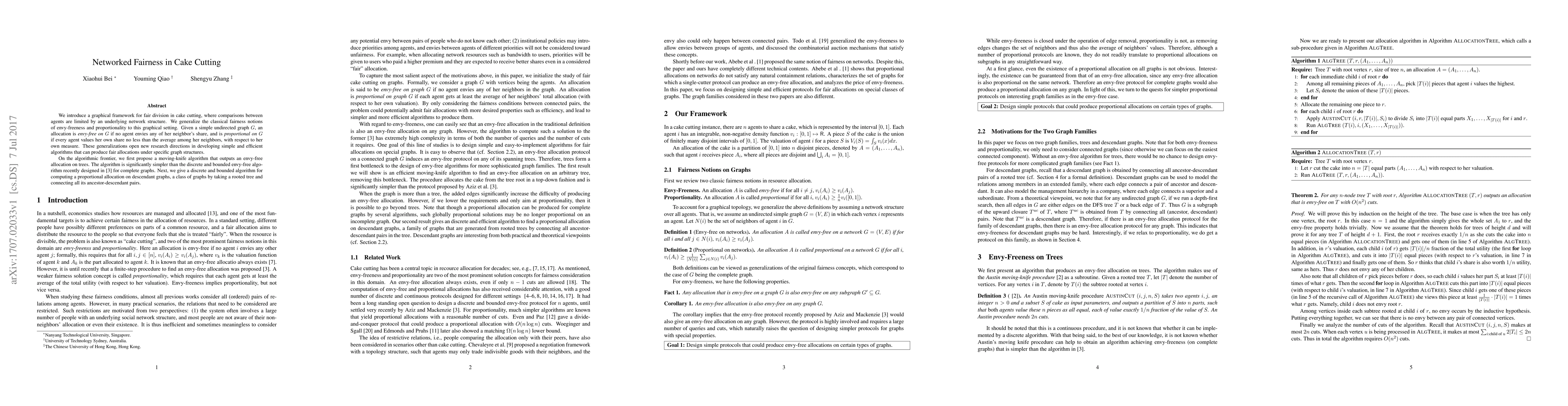We introduce a graphical framework for fair division in cake cutting, where comparisons between agents are limited by an underlying network structure. We generalize the classical fairness notions of envy-freeness and proportionality to this graphical setting. Given a simple undirected graph G, an allocation is envy-free on G if no agent envies any of her neighbor's share, and is proportional on G if every agent values her own share no less than the average among her neighbors, with respect to her own measure. These generalizations open new research directions in developing simple and efficient algorithms that can produce fair allocations under specific graph structures. On the algorithmic frontier, we first propose a moving-knife algorithm that outputs an envy-free allocation on trees. The algorithm is significantly simpler than the discrete and bounded envy-free algorithm recently designed by Aziz and Mackenzie for complete graphs. Next, we give a discrete and bounded algorithm for computing a proportional allocation on descendant graphs, a class of graphs by taking a rooted tree and connecting all its ancestor-descendant pairs.