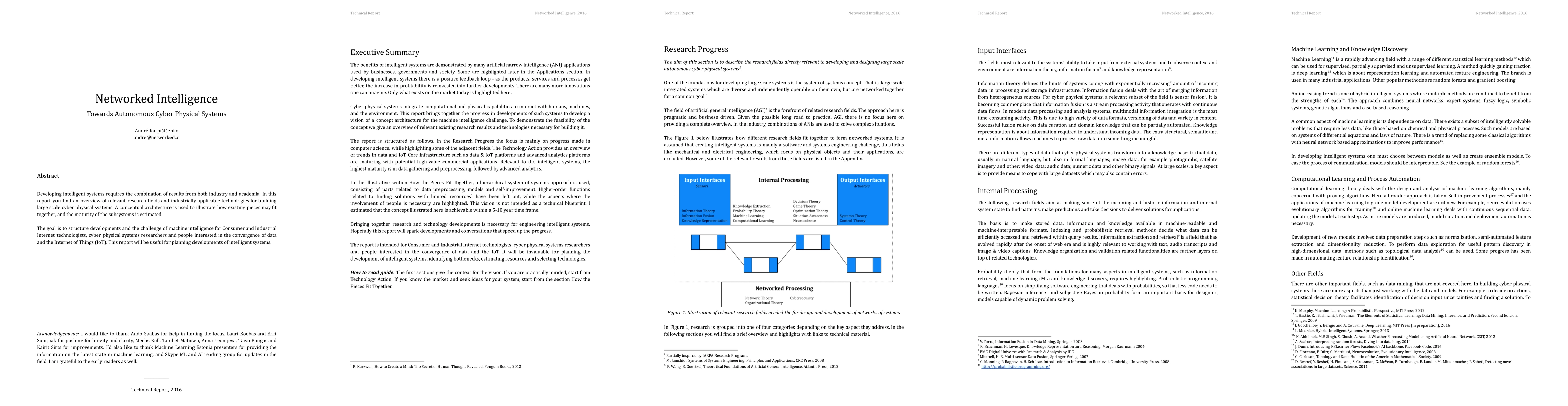Developing intelligent systems requires combining results from both industry and academia. In this report you find an overview of relevant research fields and industrially applicable technologies for building very large scale cyber physical systems. A concept architecture is used to illustrate how existing pieces may fit together, and the maturity of the subsystems is estimated. The goal is to structure the developments and the challenge of machine intelligence for Consumer and Industrial Internet technologists, cyber physical systems researchers and people interested in the convergence of data & Internet of Things. It can be used for planning developments of intelligent systems.