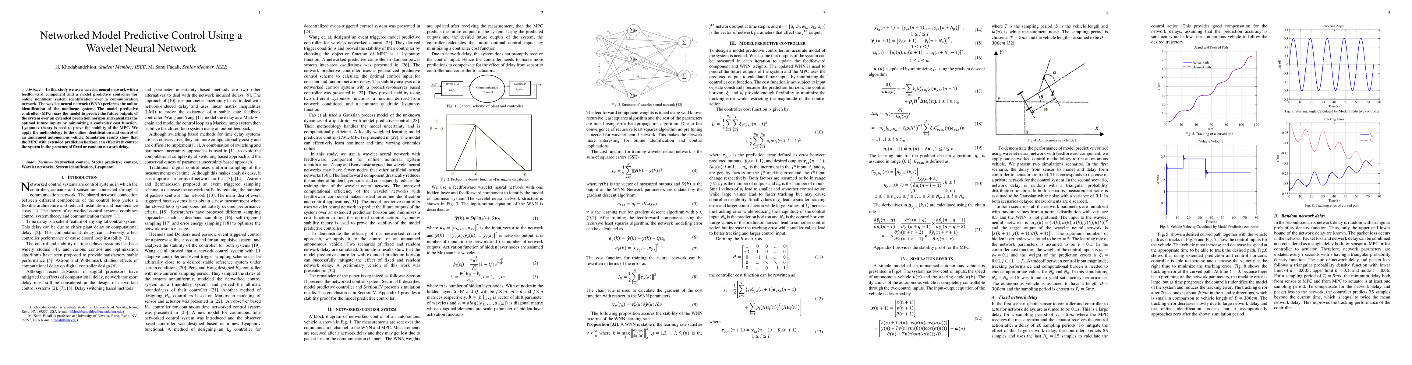 This study combines a wavelet neural network for online nonlinear system identification and a model predictive controller (MPC) for control over a communication network. The Lyapunov theory ensures stability, and simulations demonstrate effective control of an unmanned autonomous vehicle despite network delays.