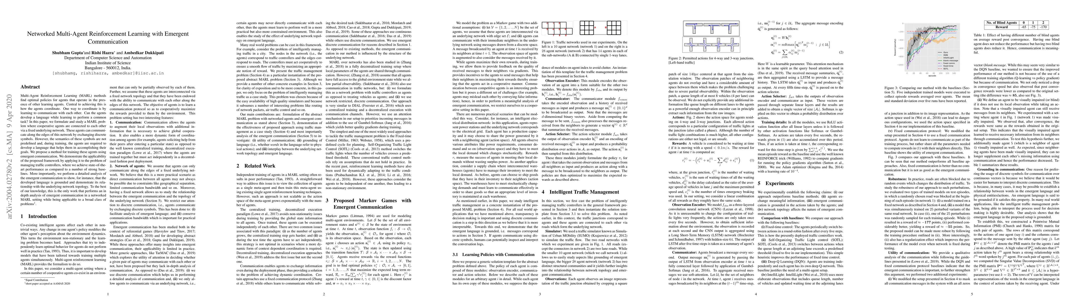 This paper explores Multi-Agent Reinforcement Learning (MARL) in networked agents that communicate via emergent discrete symbols to develop a language for coordinating tasks. The proposed training method achieves state-of-the-art performance in traffic controller management and provides a detailed analysis of the grounded nature and network-topology relationship of the emergent communication.