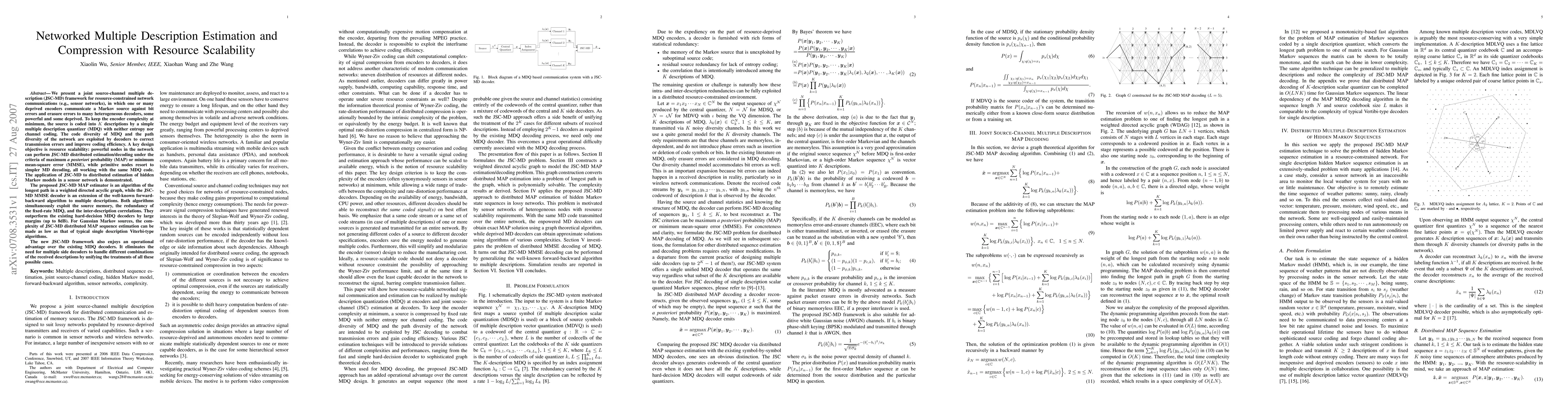 We present a joint source-channel multiple description (JSC-MD) framework for resource-constrained network communications (e.g., sensor networks), in which one or many deprived encoders communicate a Markov source against bit errors and erasure errors to many heterogeneous decoders, some powerful and some deprived. To keep the encoder complexity at minimum, the source is coded into K descriptions by a simple multiple description quantizer (MDQ) with neither entropy nor channel coding. The code diversity of MDQ and the path diversity of the network are exploited by decoders to correct transmission errors and improve coding efficiency. A key design objective is resource scalability: powerful nodes in the network can perform JSC-MD distributed estimation/decoding under the criteria of maximum a posteriori probability (MAP) or minimum mean-square error (MMSE), while primitive nodes resort to simpler MD decoding, all working with the same MDQ code. The application of JSC-MD to distributed estimation of hidden Markov models in a sensor network is demonstrated. The proposed JSC-MD MAP estimator is an algorithm of the longest path in a weighted directed acyclic graph, while the JSC-MD MMSE decoder is an extension of the well-known forward-backward algorithm to multiple descriptions. Both algorithms simultaneously exploit the source memory, the redundancy of the fixed-rate MDQ, and the inter-description correlations. They outperform the existing hard-decision MDQ decoders by large margins (up to 8dB). For Gaussian Markov sources, the complexity of JSC-MD distributed MAP sequence estimation can be made as low as that of typical single description Viterbi-type algorithms.