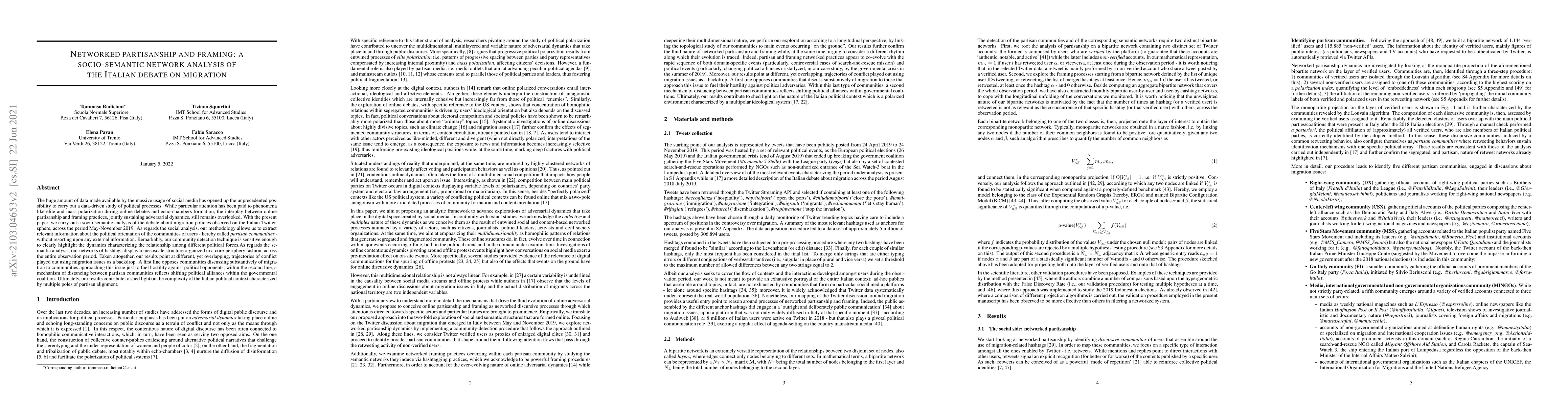 The huge amount of data made available by the massive usage of social media has opened up the unprecedented possibility to carry out a data-driven study of political processes. While particular attention has been paid to phenomena like elite and mass polarization during online debates and echo-chambers formation, the interplay between online partisanship and framing practices, jointly sustaining adversarial dynamics, still remains overlooked. With the present paper, we carry out a socio-semantic analysis of the debate about migration policies observed on the Italian Twittersphere, across the period May-November 2019. As regards the social analysis, our methodology allows us to extract relevant information about the political orientation of the communities of users - hereby called partisan communities - without resorting upon any external information. Remarkably, our community detection technique is sensitive enough to clearly highlight the dynamics characterizing the relationship among different political forces.As regards the semantic analysis, our networks of hashtags display a mesoscale structure organized in a core-periphery fashion, across the entire observation period. Taken altogether, our results point at different, yet overlapping, trajectories of conflict played out using migration issues as a backdrop. A first line opposes communities discussing substantively of migration to communities approaching this issue just to fuel hostility against political opponents; within the second line, a mechanism of distancing between partisan communities reflects shifting political alliances within the governmental coalition. Ultimately, our results contribute to shed light on the complexity of the Italian political context characterized by multiple poles of partisan alignment.