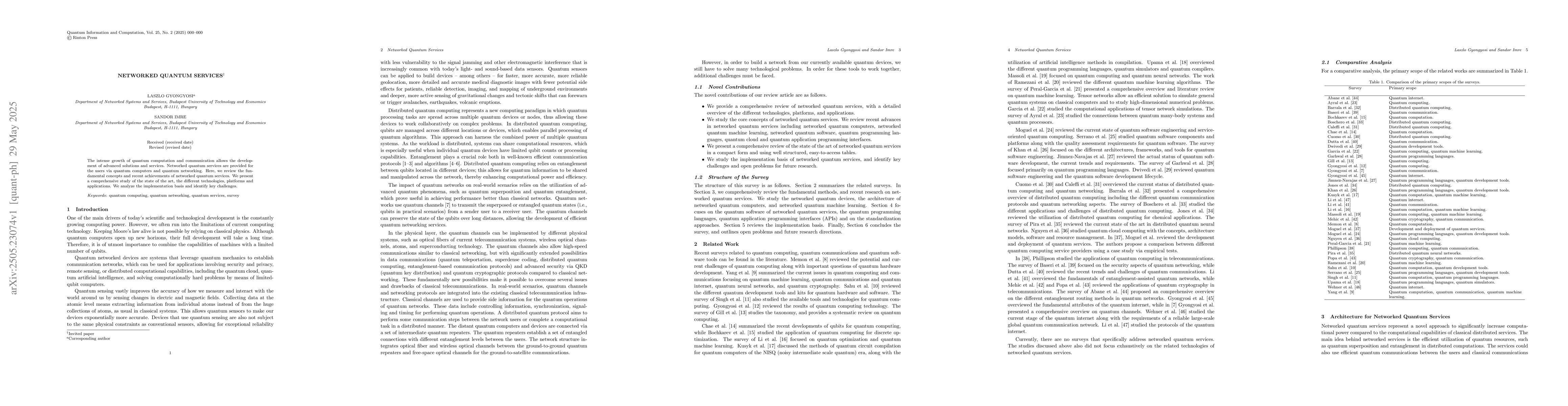 The paper provides a comprehensive review of networked quantum services, discussing fundamental concepts, technologies, platforms, applications, and challenges.