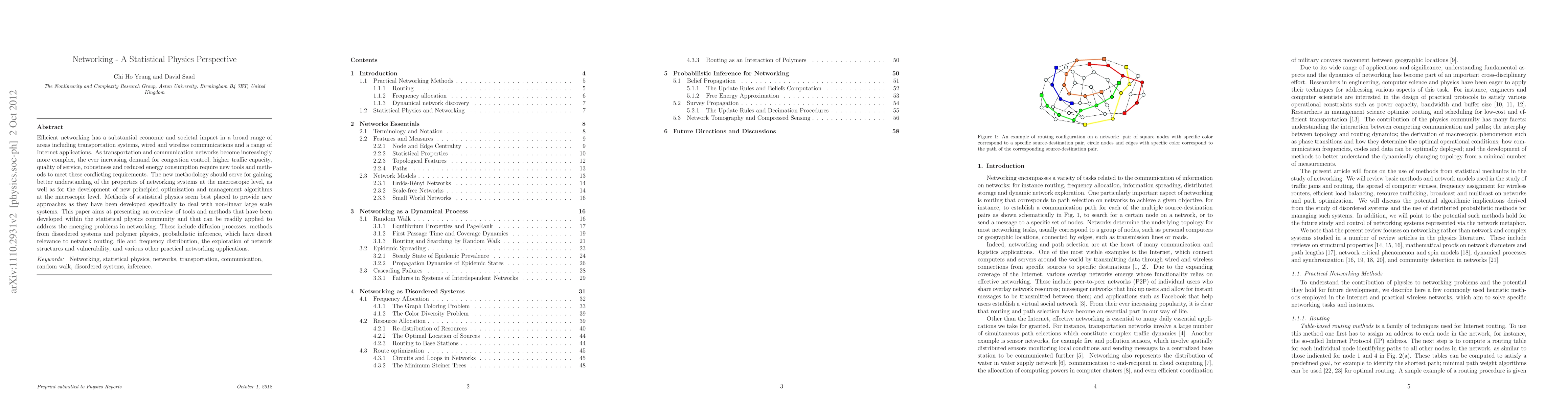 This paper provides an overview of statistical physics methods applicable to networking, emphasizing tools for understanding and optimizing large-scale network systems, including congestion control, traffic capacity, and energy efficiency. It highlights techniques from diffusion processes, disordered systems, and probabilistic inference for addressing complex networking challenges.
